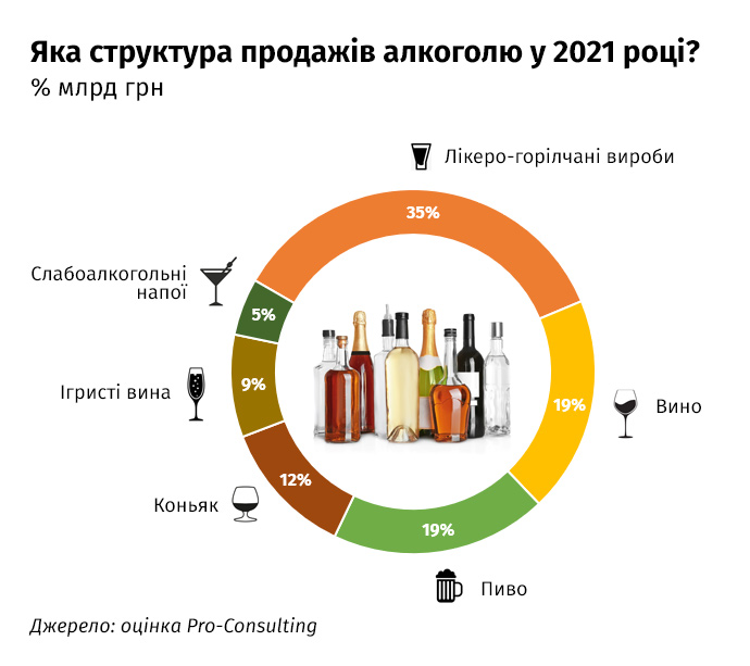 По данным исследовательской компании Pro-Consulting в 2021 году наибольшую долю продаж в денежном выражении составляли ликероводочные изделия – 35% от общих продаж. Второе и третье места с одинаковым результатом по 19% заняли пиво и вино.