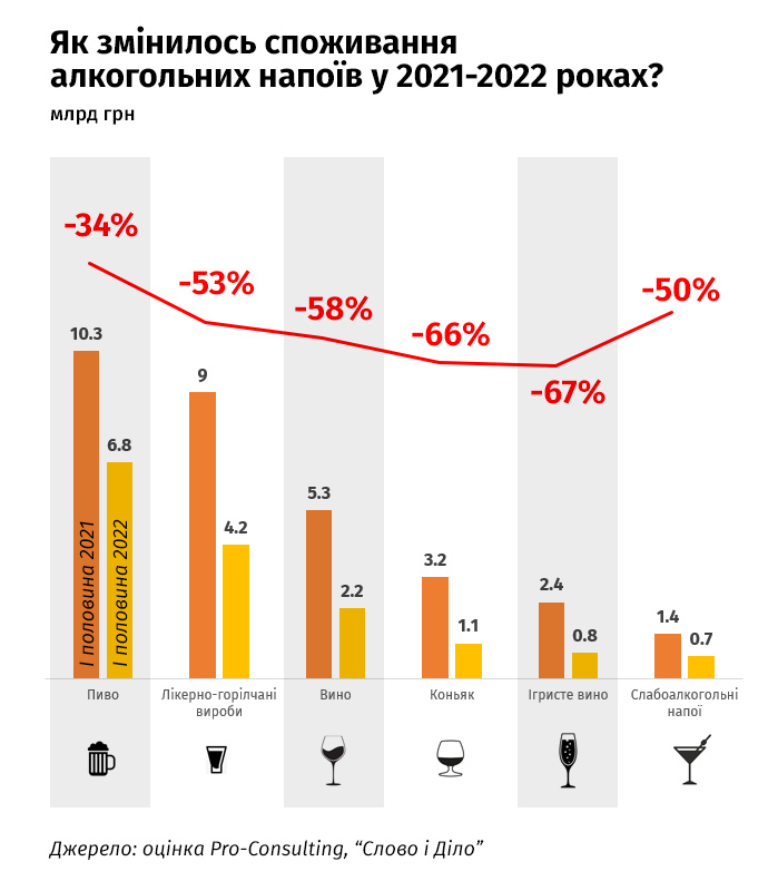 Однако война изменила в 2022 году объемы потребления и производства алкогольных напитков, что сразу привело к падению продаж во всех категориях. По данным Pro-Consulting, в январе-июне 2022 года украинцы купили пива на 6,8 млрд. грн., что на 34% меньше по сравнению с аналогичным периодом 2021 года. Продажи водки упали на 53%, вина – на 58%, коньяка – на 66%. Больше всего потеряли игристые вина – минус 67%.