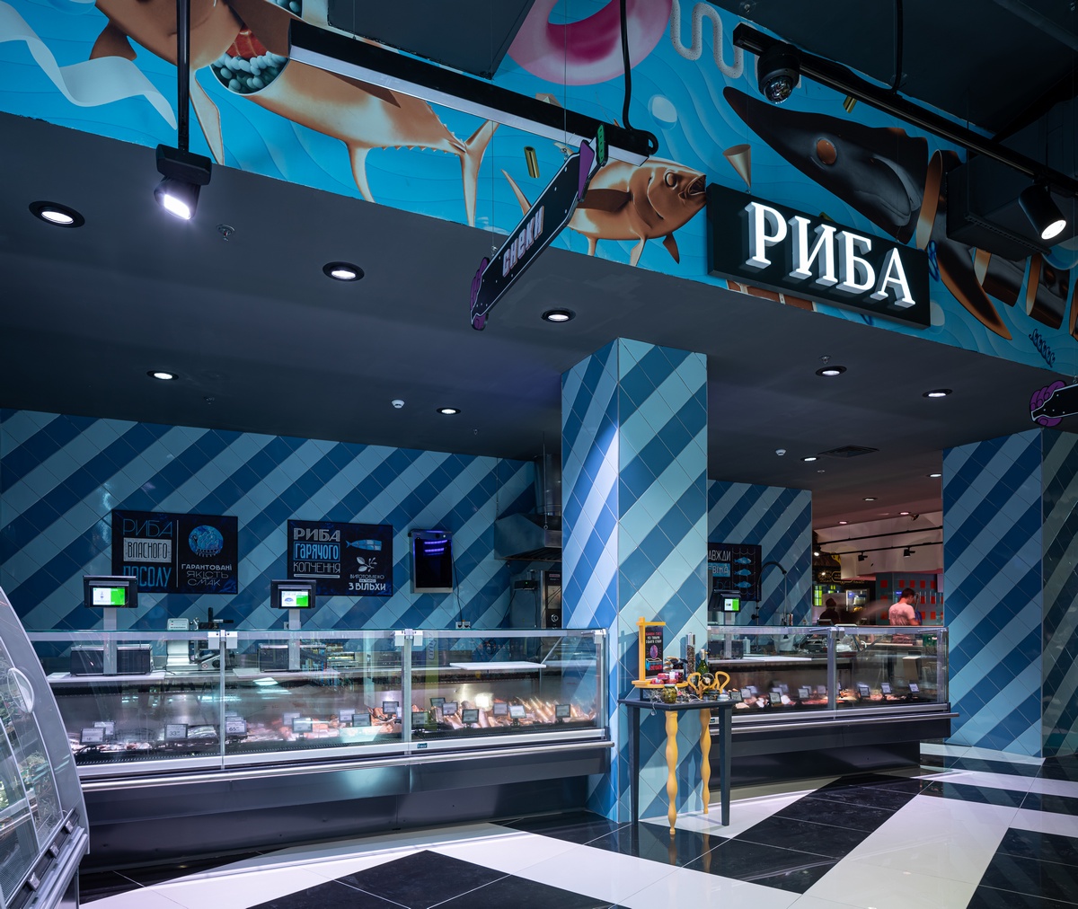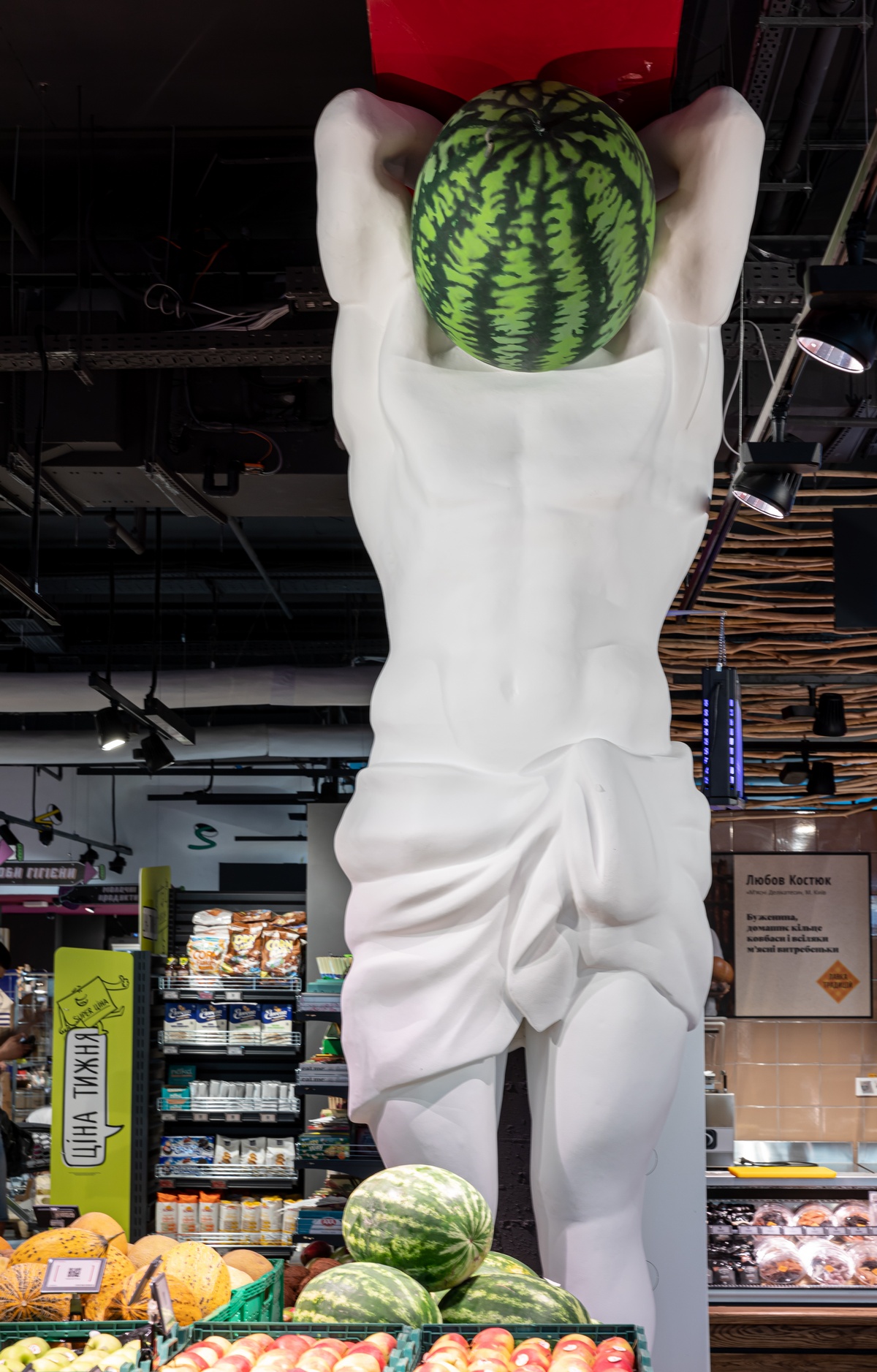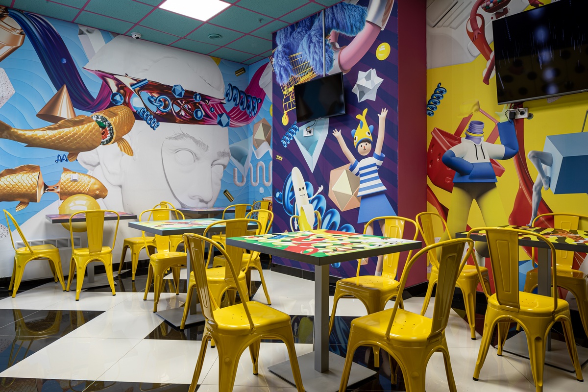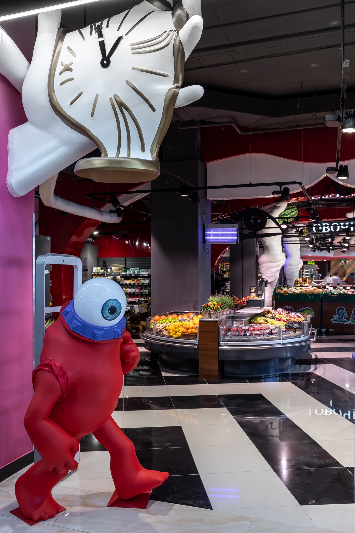На входе в торговый зал площадью 1065 кв. м гостей встречает огромная фиолетовая маска Дали, который смотрит всегда прямо на покупателя, откуда бы он не подошел. Время из известного художественного произведения художника “стекает” прямо в ведерко на полу. Внутри магазина – артобъекты, которые на глазах гостей “оживают”. Полосатый черно-белый пол медленно переходит в “зебру” на колоннах. Атланты держат мир на плечах, но вместо головы у них то арбузы, то ананасы.