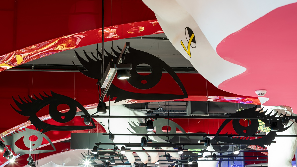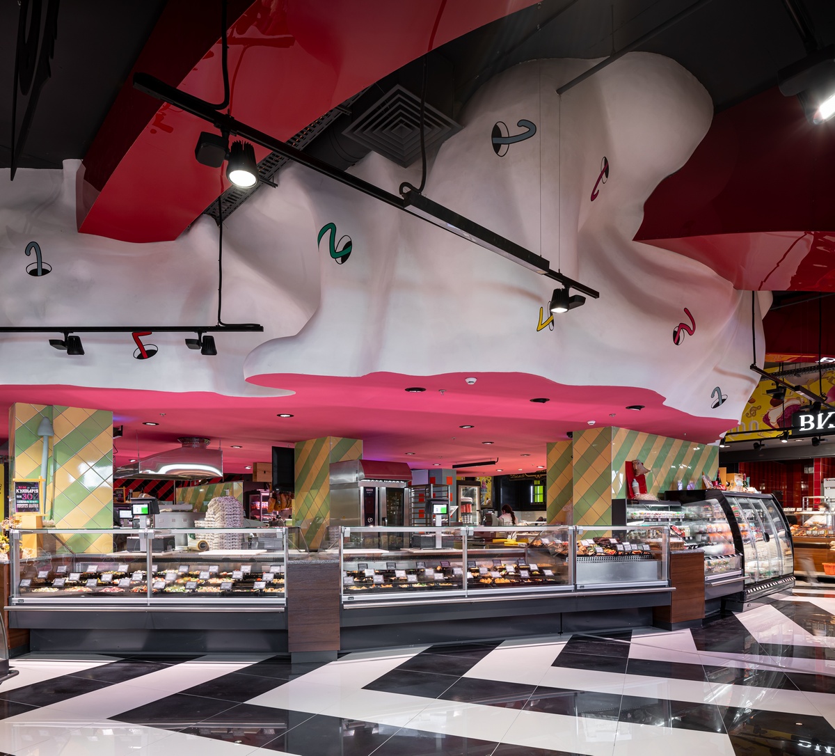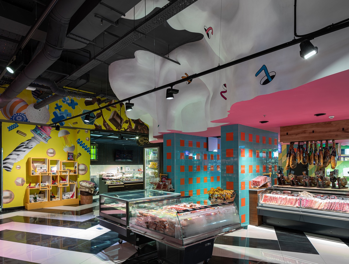 Символические изображения органов чувств будто нависают над полками с товаром, к которым “тянутся” руки с потолка. На кислотно-цветных стенах, словно сделанных из сыра, шлют воздушные поцелуи изображения Мэрилин Монро. А неподалеку от касс на выходе из магазина прямо на потолке “растет” поляна грибов.