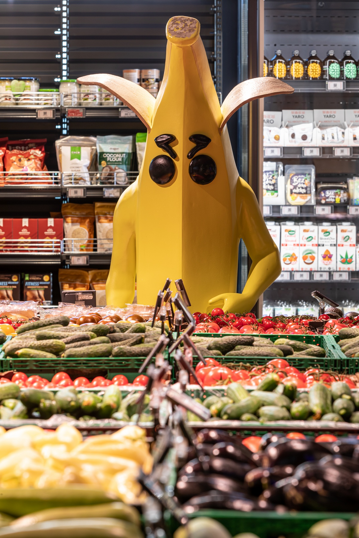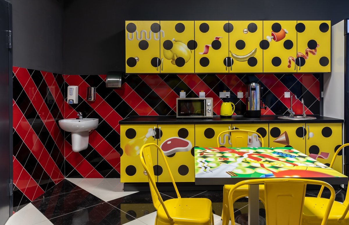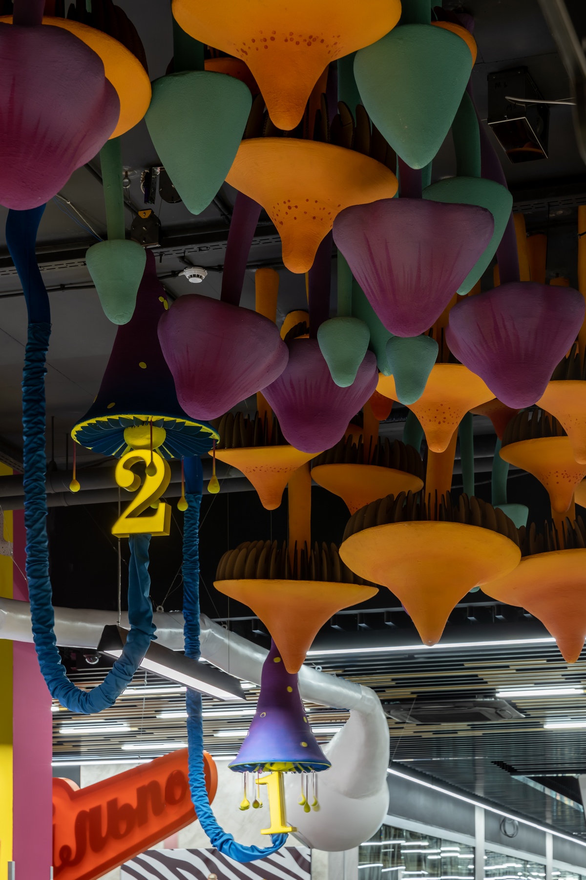 Символические изображения органов чувств будто нависают над полками с товаром, к которым “тянутся” руки с потолка. На кислотно-цветных стенах, словно сделанных из сыра, шлют воздушные поцелуи изображения Мэрилин Монро. А неподалеку от касс на выходе из магазина прямо на потолке “растет” поляна грибов.
