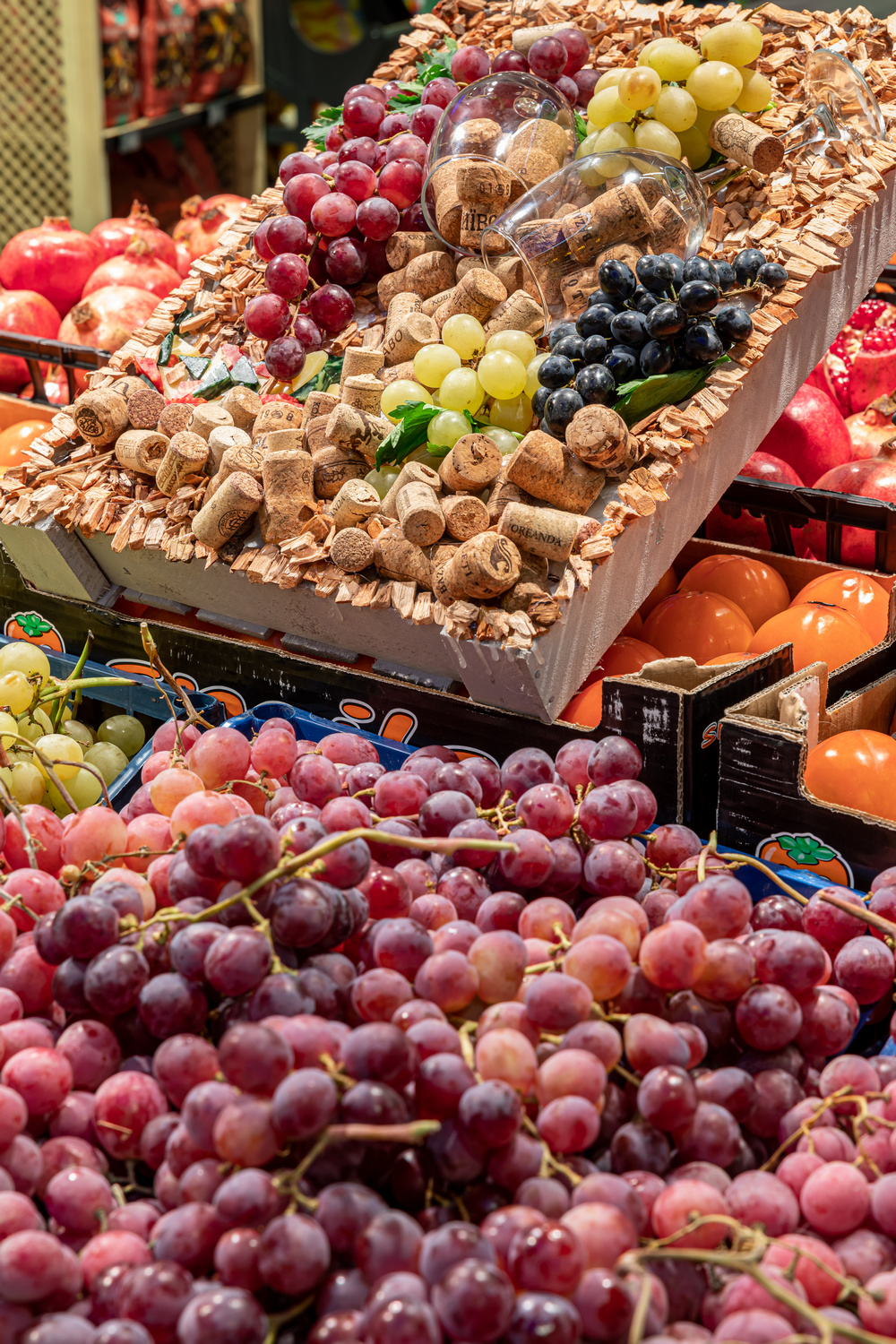 На входе гостей встречает виноградная лоза, которая идет к фризу и много разных объемных виноградинок на стене. В зале в специальных бочках находятся красное, белое и розовое вино, а в отделе овощей и фруктов под потолком размещены четыре световых круга, посвященных разным сортам винограда. На обоях и колоннах изображен декоративный виноград для создания впечатления тени и живой изгороди.