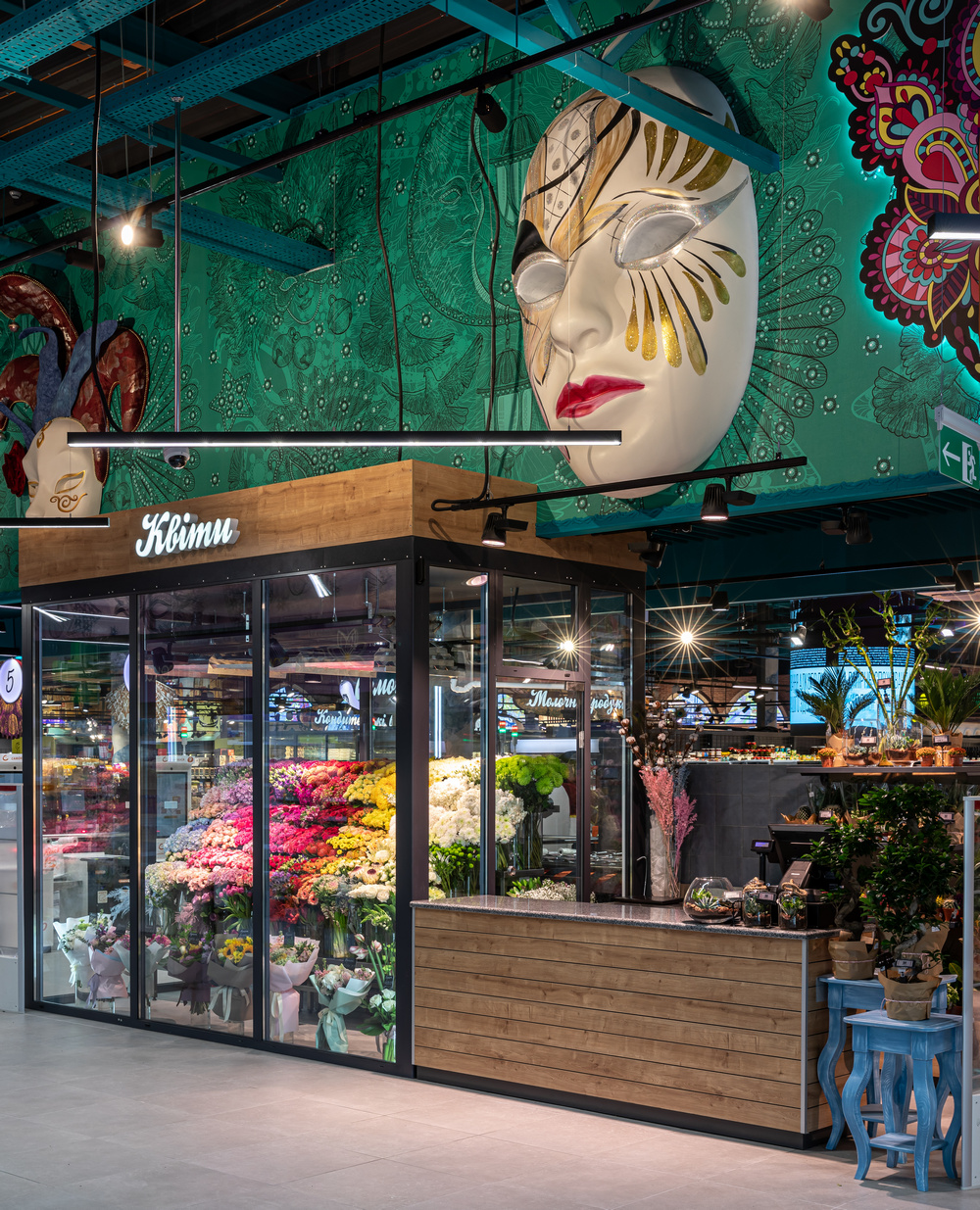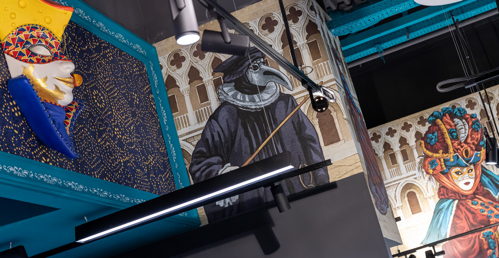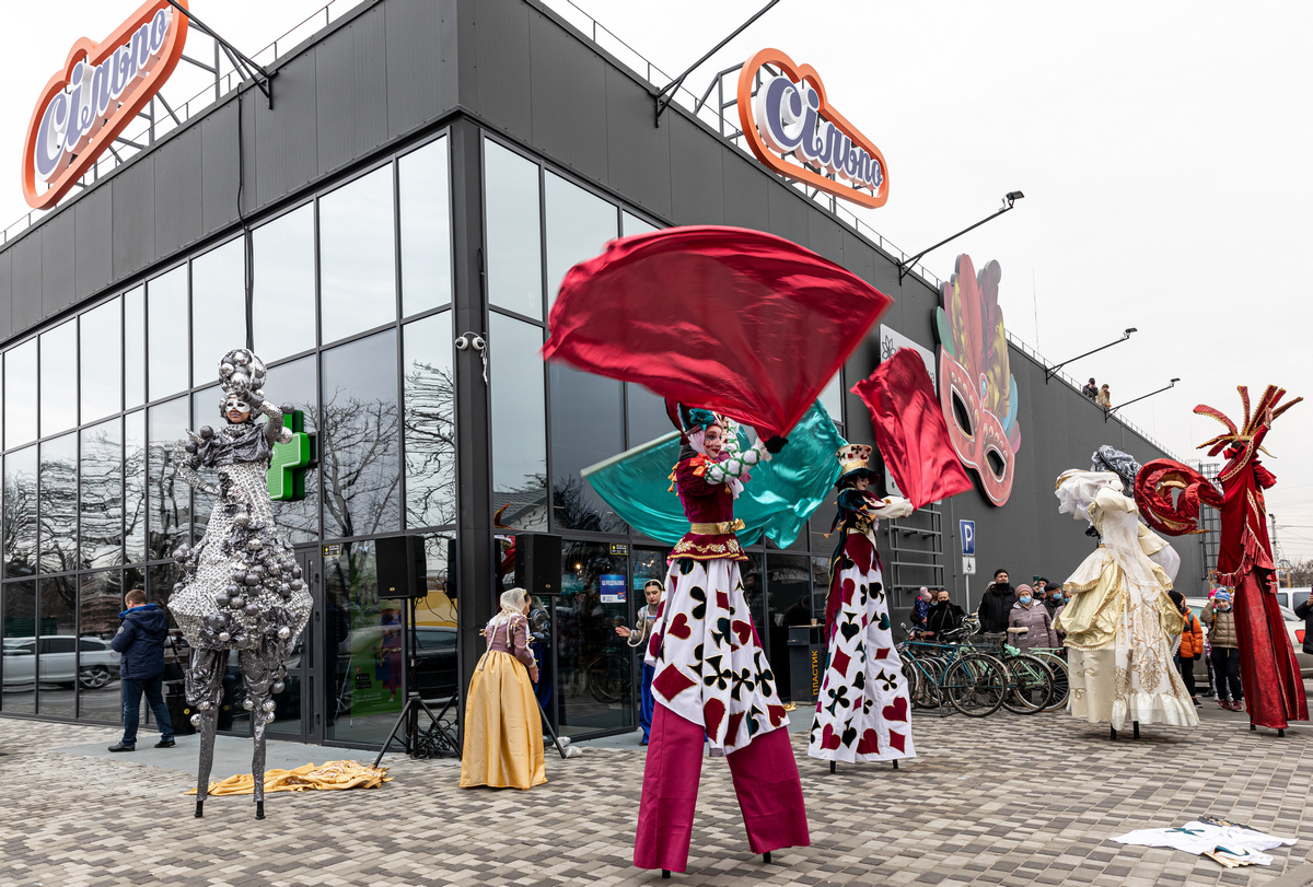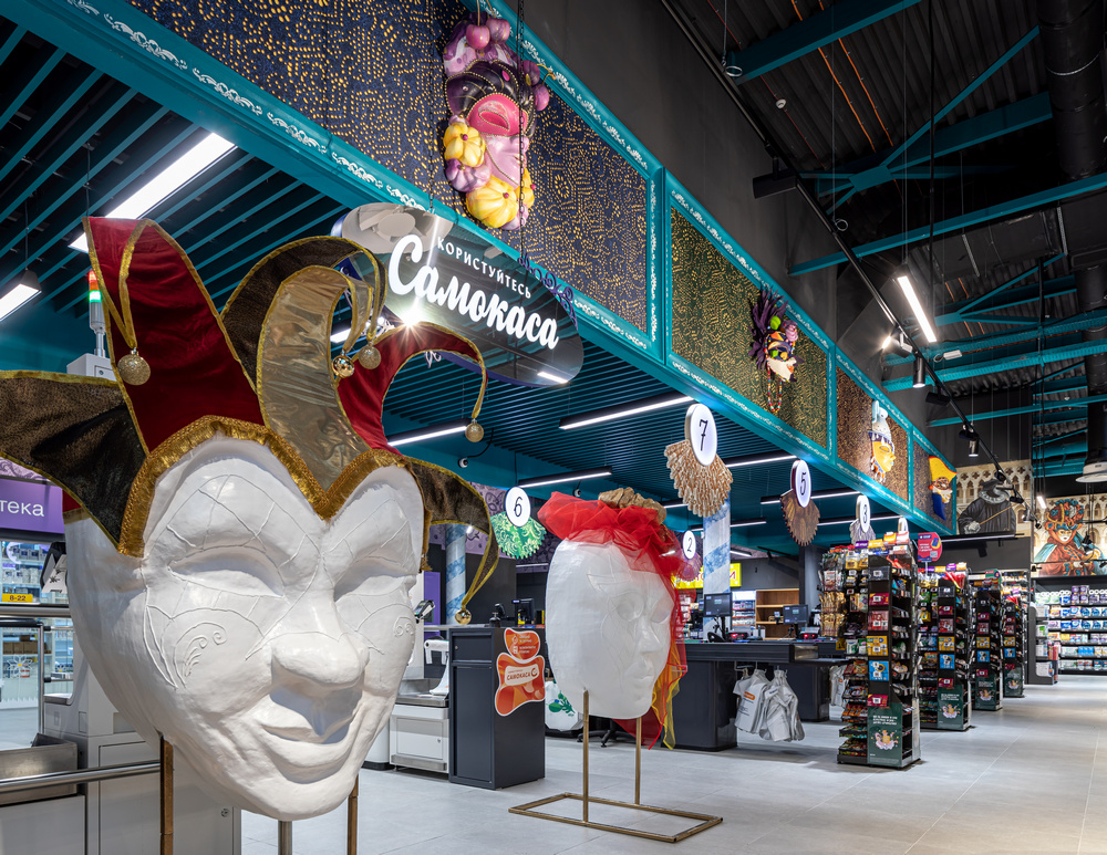 К созданию дизайна этого супермаркета команду Сільпо вдохновил известный костюмированный маскарад Италии. Пространство и интерьер магазина наполнены главными атрибутами праздника – пышными костюмами, масками и веерами. Чтобы подчеркнуть широкий ассортимент Сільпо, в супермаркете разместили как классические маски, так и с тематикой продуктов. Например, маску сырного человека, маску-мороженое и маску со сладостями.