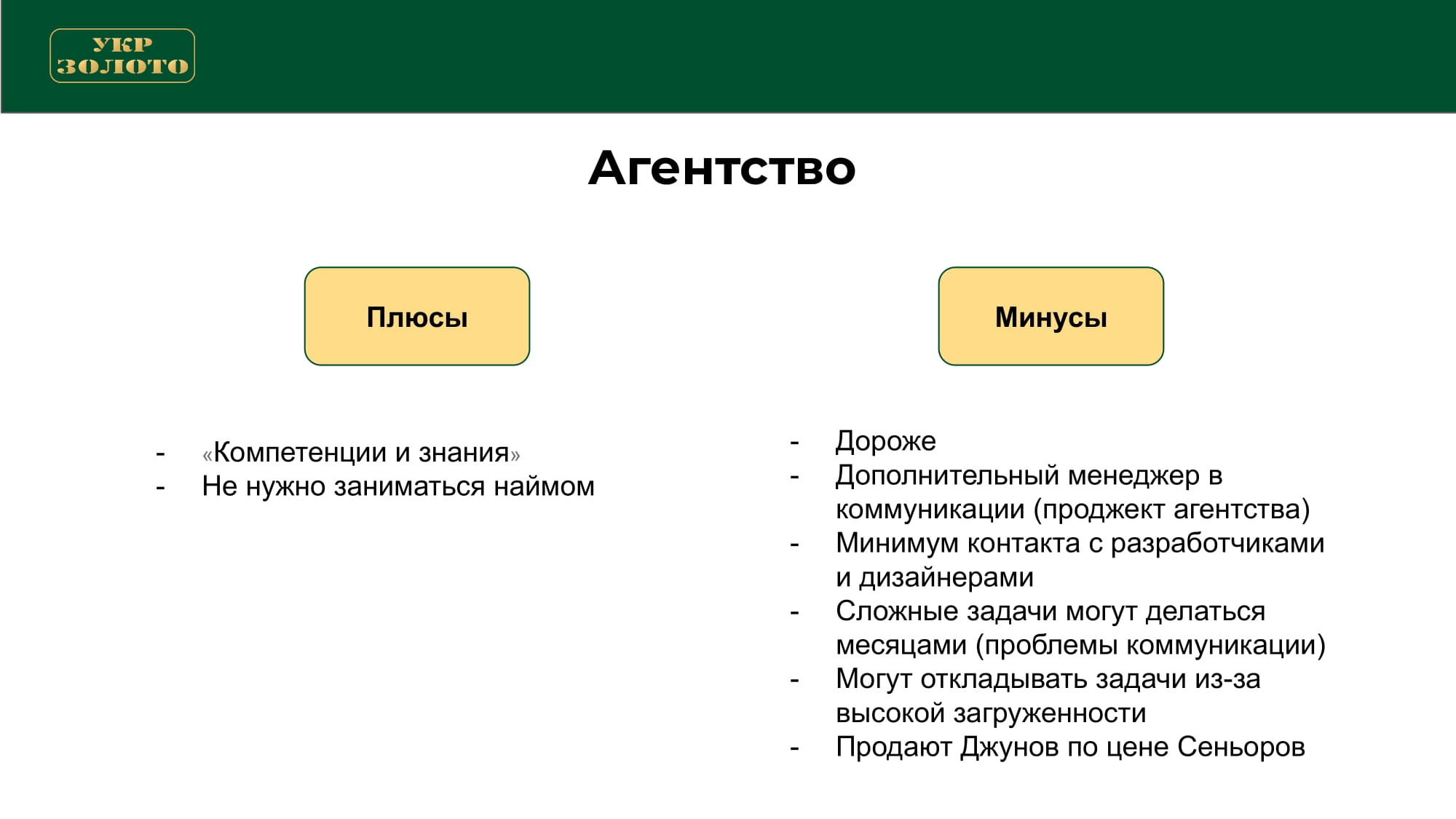 Преимущества агентства: скорость разработки, сильные компетенции и знания различных технологий, а также отсутствие необходимости заниматься поиском специалистов.