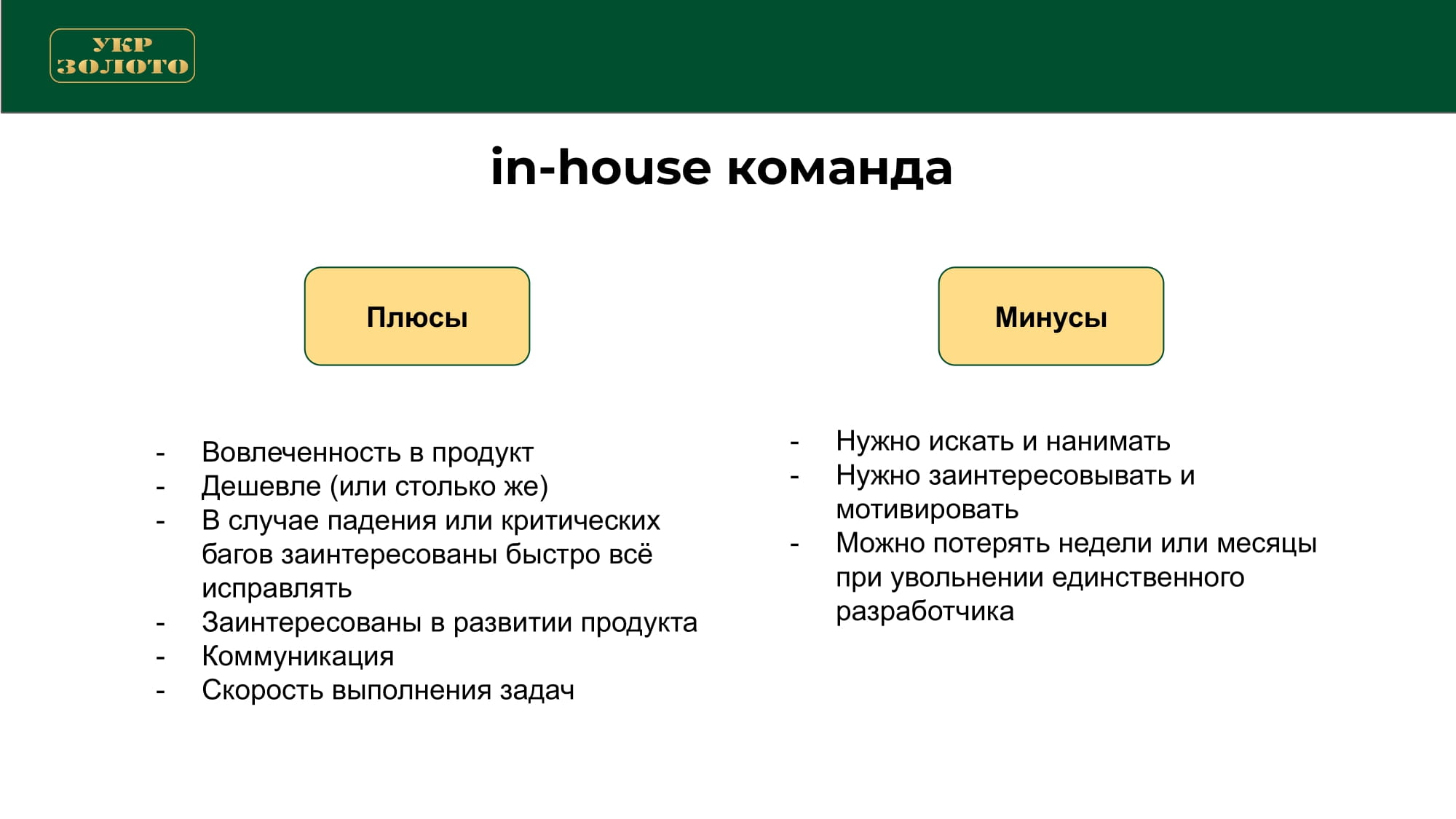 Недостатки in-house команды: необходимость самостоятельного поиска специалистов, нужно их заинтересовать и мотивировать, а в случае наличия единственного разработчика, придется потратить много времени после его увольнения.