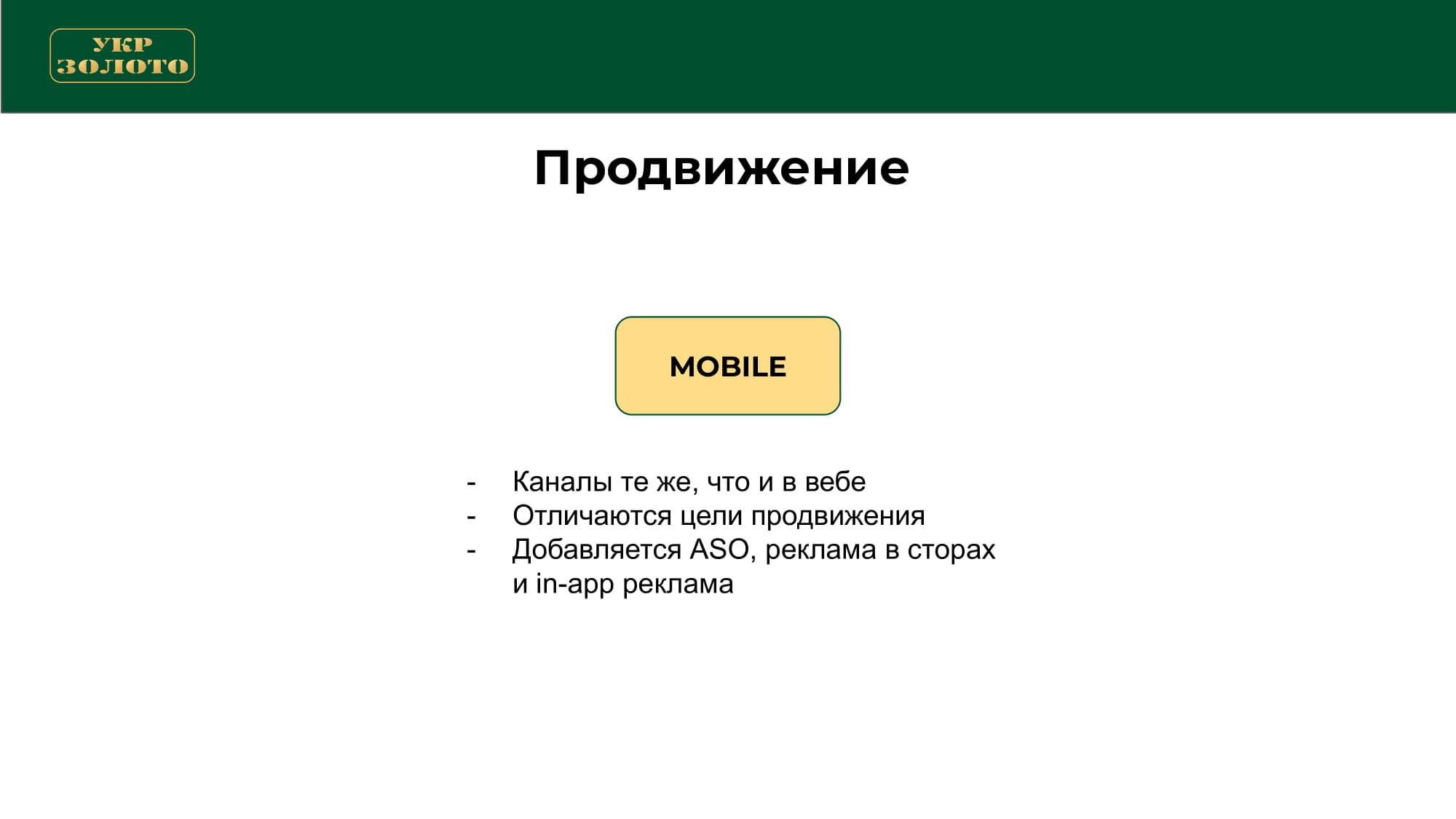 Продвижение с помощью мобильного приложения происходит через аналогичные каналы веб-платформы, но отличаются его цели и добавляется ASO (поисковое продвижение в сторах), реклама в сторах и in-app реклама (внутри других приложений).