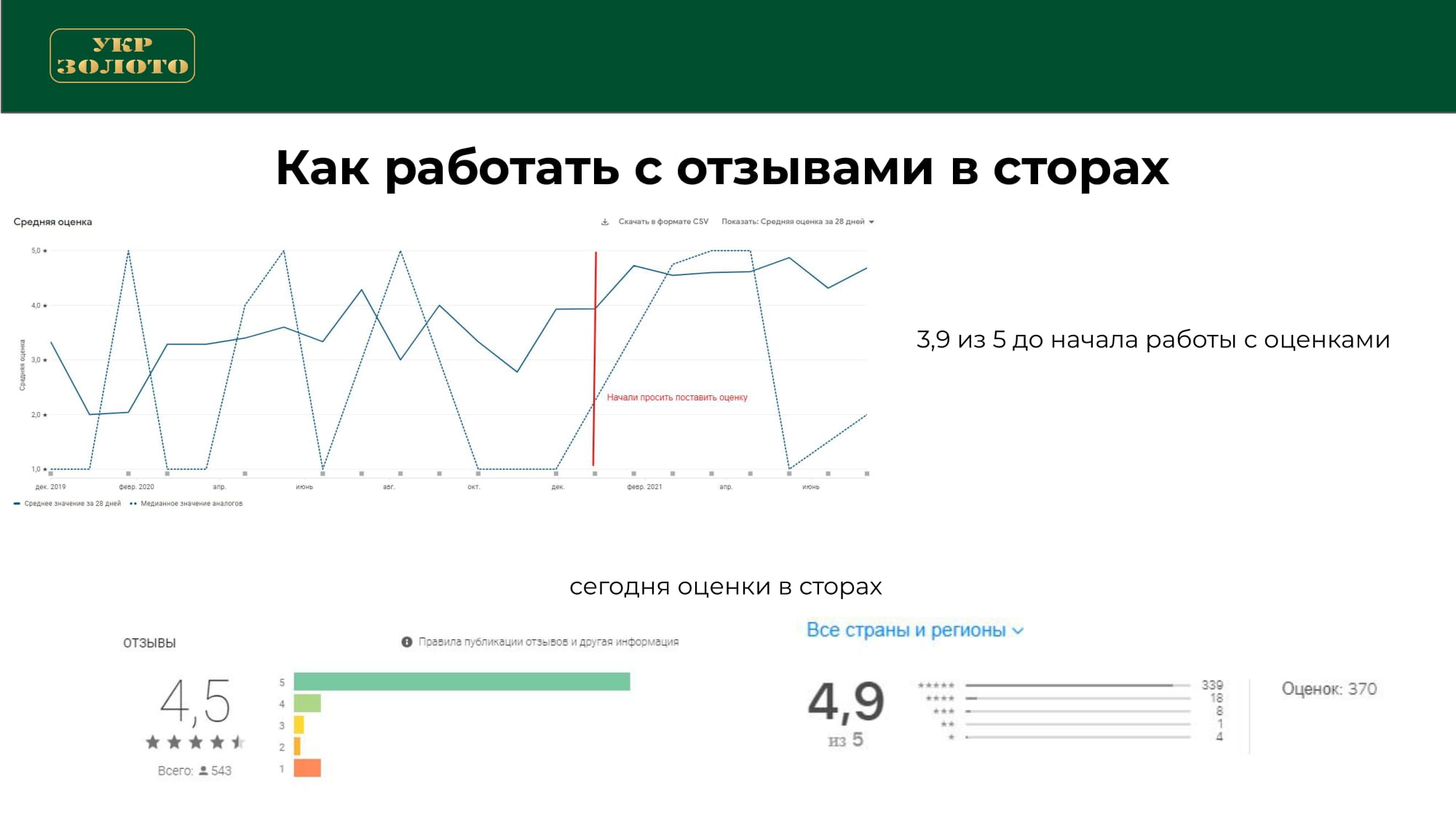 Согласно статистике, 80% приложений в сторах и PlayMarket, имеют оценки в 2 балла и только 20% имеют оценки более 4 баллов. Укрзолото начало работать с отзывами лишь в начале 2021 года, поскольку оценка компании упала до показателя в 3,9. Поэтому мы внедрили в приложение такую опцию, что после оформления заказа, клиента просят оставит любой отзыв. И буквально через месяц наши оценки выросли до 4,5-4,9.