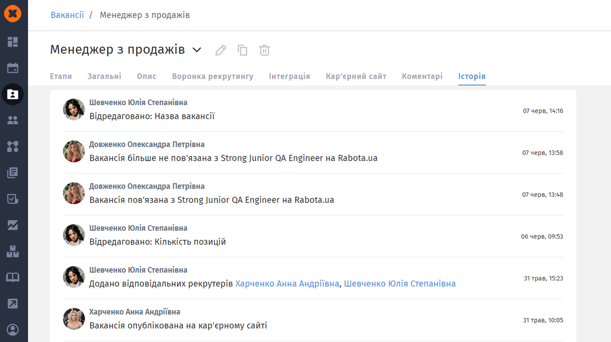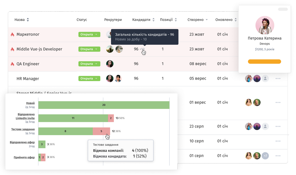 Рекрутерам система предлагает инструменты для полного цикла работы над вакансией. В несколько кликов они могут создать карьерную страницу или разместить вакансию на популярных job-сайтах благодаря удобной интеграции. Кроме того, очень важно, что система обладает функциями создания ссылок для размещения вакансий в социальных сетях, а сейчас найм в соцсетях работает очень хорошо. Далее все кандидаты будут автоматически попадать на Kanban-доску, где рекрутер может наглядно видеть кто на каком этапе находится. Также в системе есть возможность настроить автоматическую отправку писем при переходе кандидата на новый этап воронки.