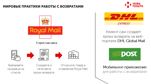 В Нова пошта, чтобы уменьшить процент возвратов, разрешили осмотр товара на предмет соответствия и качества до оплаты, также ввели автоматический возврат товара продавцу через 5 дней, если покупатель не обратился за товаром. Новая почта решила и другую проблему логистической цепи: вернуть товар теперь можно на любой адрес – раньше товар ехал только в пункт отправки.