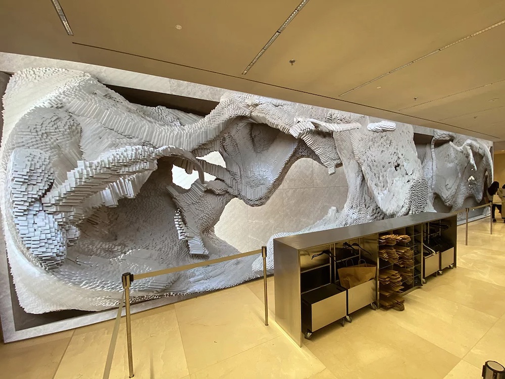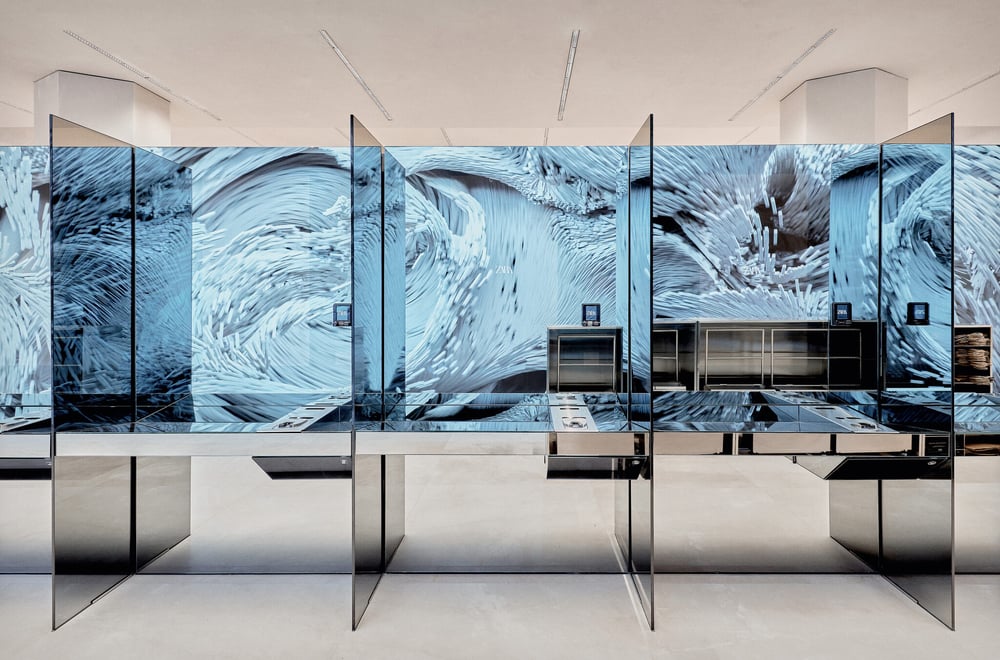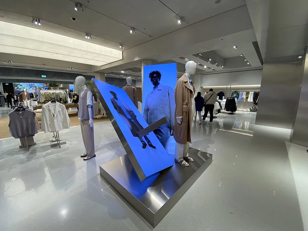 При входе в магазин покупателей встречает один из крупнейших в Европе внутренних светодиодных экранов с двойным разрешением 4k. На экране отображаются генеративные изображения, которые постоянно развиваются, реагируя на действия клиентов, когда они используют эскалатор, позволяя покупателям взаимодействовать с цифровыми технологиями в режиме реального времени.