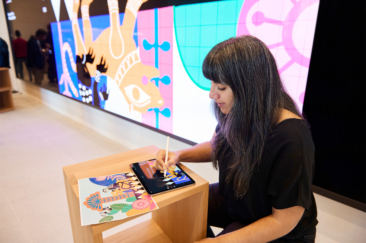 Почти 14-метровая парадная лестница, одна из самых высоких в любом магазине Apple в мире, ведет на второй этаж, где размещен The Forum с видеостеной. Здесь на бесплатных сессиях Today at Apple участников учат программировать, создавать кадры и редактировать видео. Today at Apple также предлагает групповое бронирование для участников, заинтересованных в обучении вместе с семьей, друзьями и коллегами, а также занятия, на которых обучают основам использования вспомогательных технологий и функций, таких как VoiceOver на iPhone и iPad.
