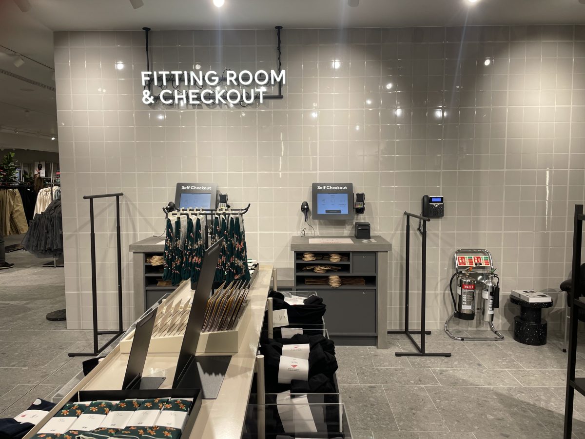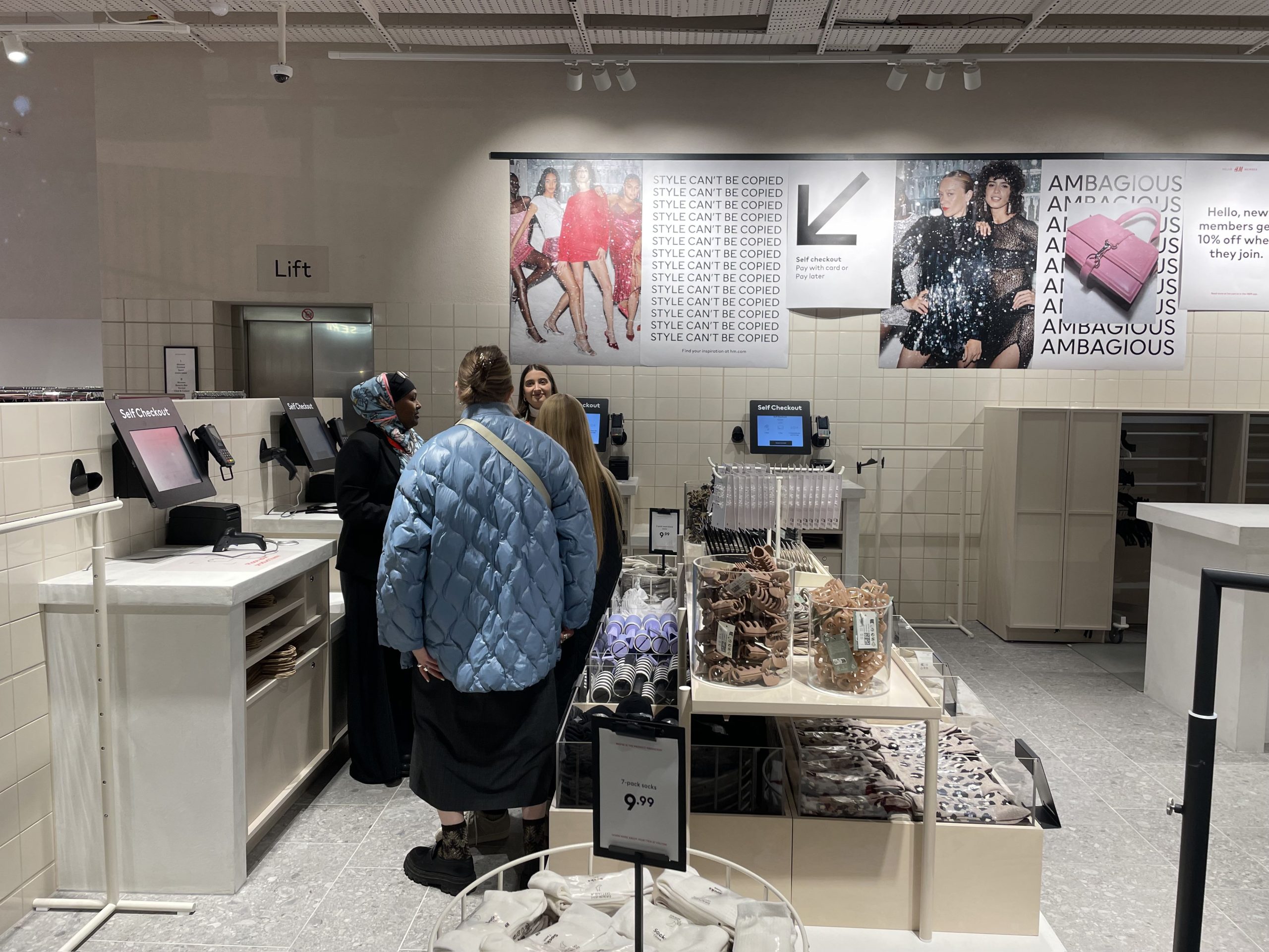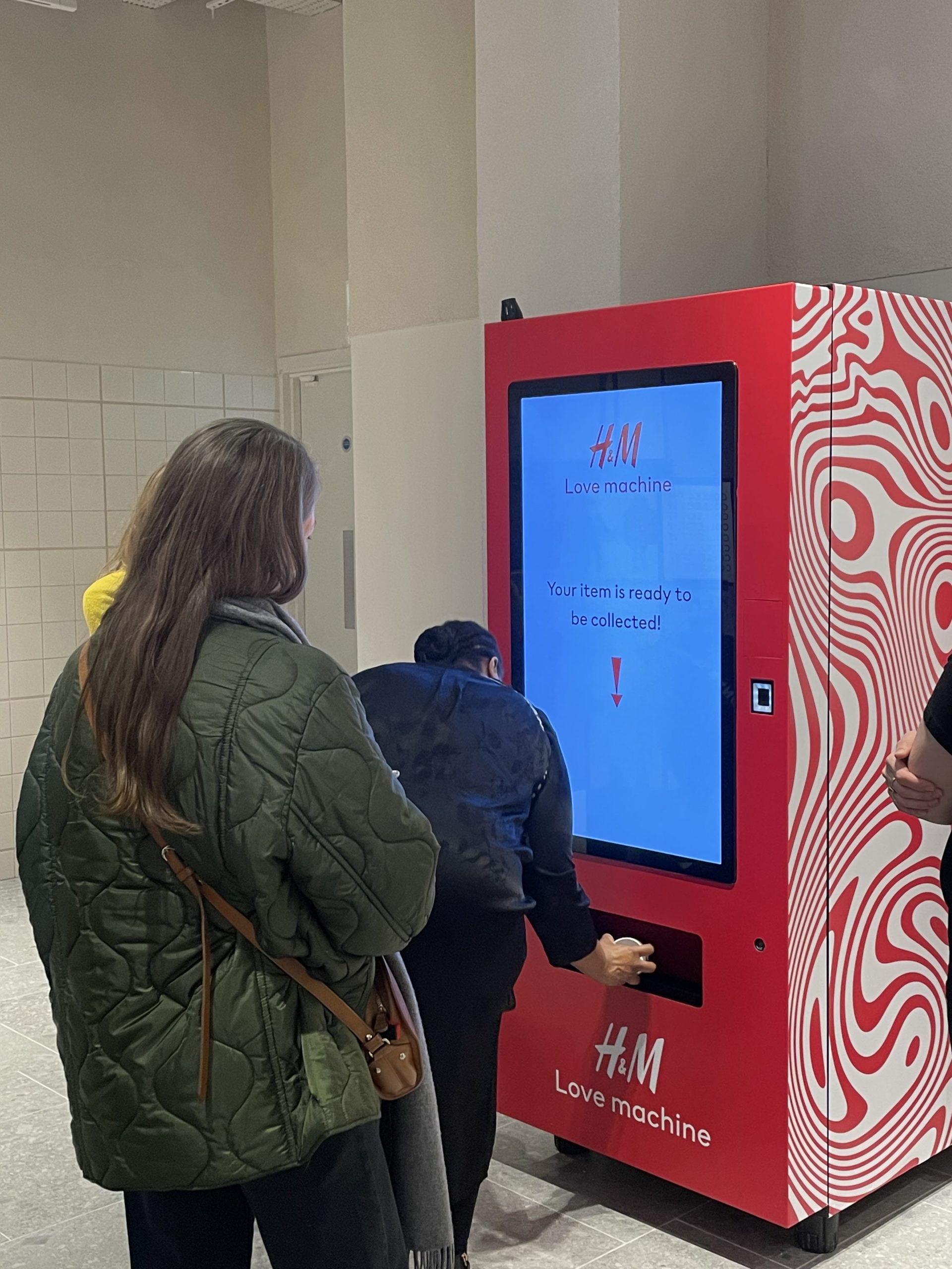 Конечно, в H&M Regent Street есть кассы Click and Collect и самообслуживания, которые призваны упростить процедуру покупки. Также в магазине есть торговый автомат, из которого можно получить бесплатную шапку, отсканировав QR-код через приложение H&M. После сканирования кода из диспенсера выкатывается картонная туба, содержащая черную шапку с логотипом H&M.