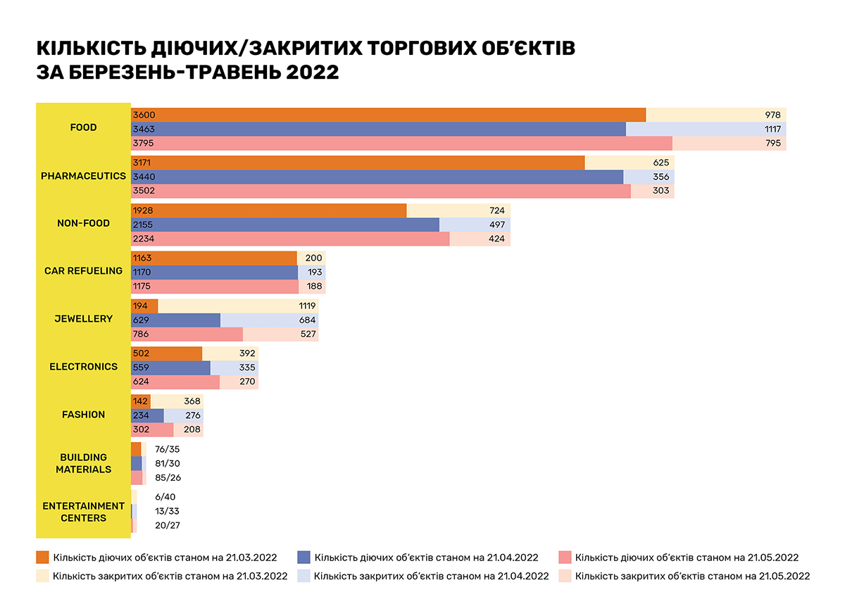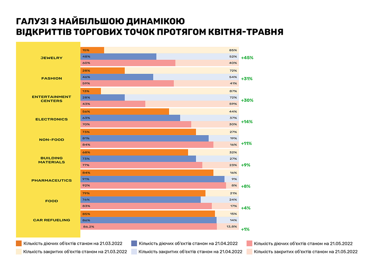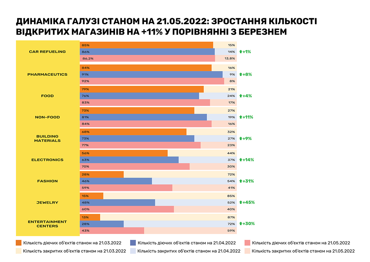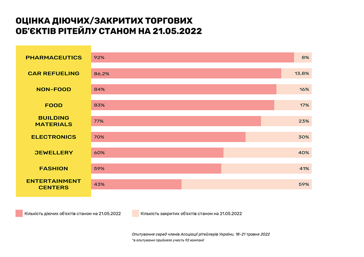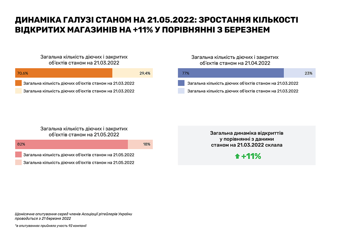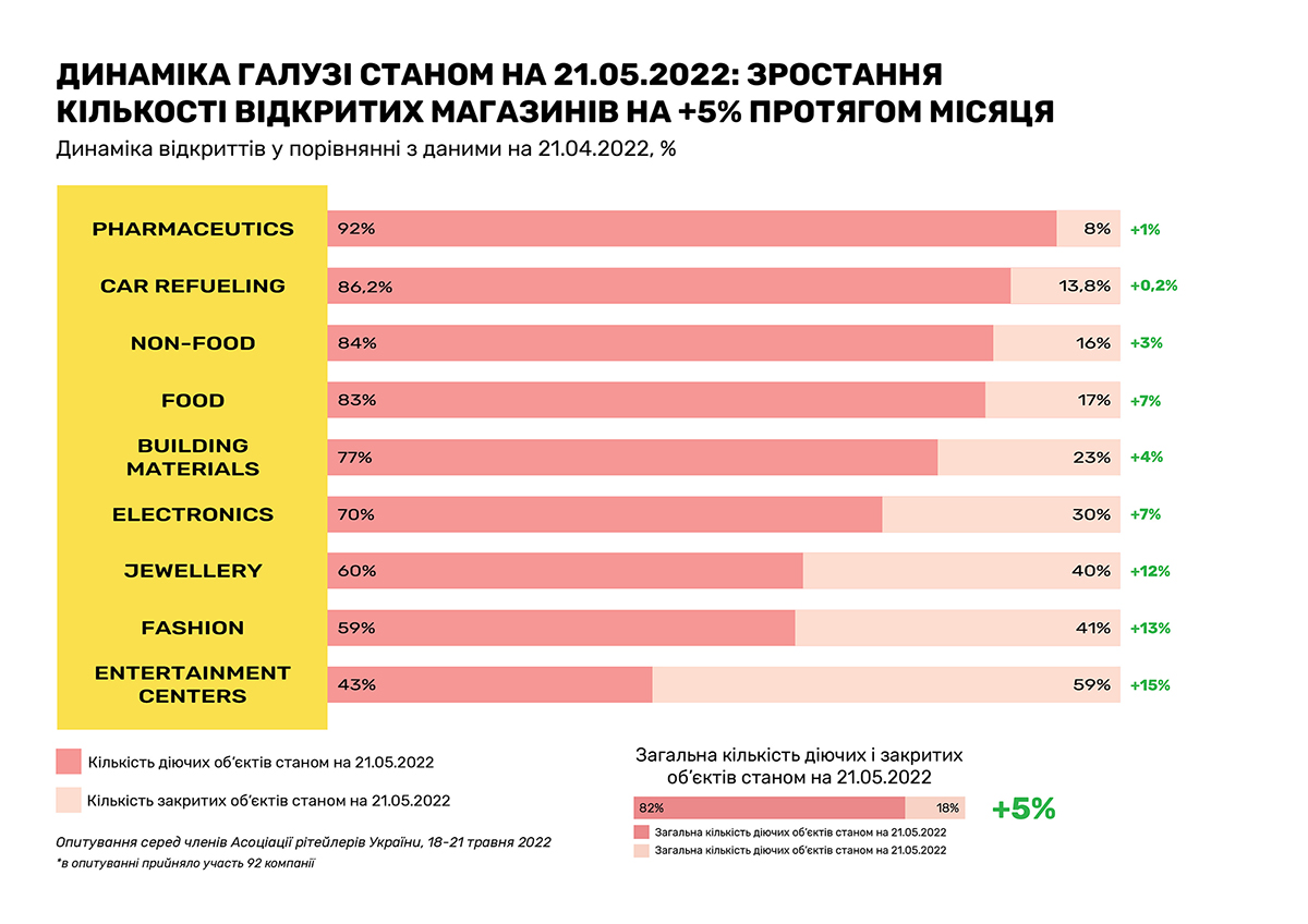 Очередное исследование, проведенное RAU методом онлайн-опроса примерно сотни владельцев и CEO предприятий по всей Украине, показало, что на 20 мая 2022 года было закрыто по тем или иным причинам только 18% торговых объектов/магазинов. Это на 5% меньше, чем аналогичный показатель месяц назад, когда начался тренд по восстановлению.