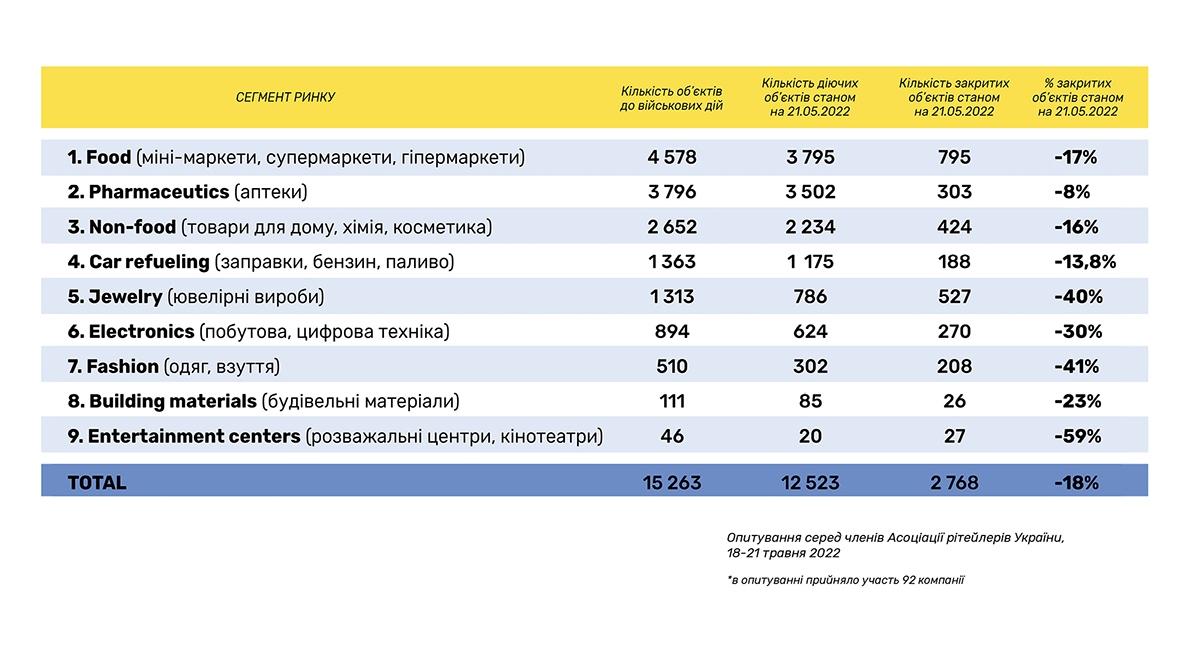 Очередное исследование, проведенное RAU методом онлайн-опроса примерно сотни владельцев и CEO предприятий по всей Украине, показало, что на 20 мая 2022 года было закрыто по тем или иным причинам только 18% торговых объектов/магазинов. Это на 5% меньше, чем аналогичный показатель месяц назад, когда начался тренд по восстановлению.