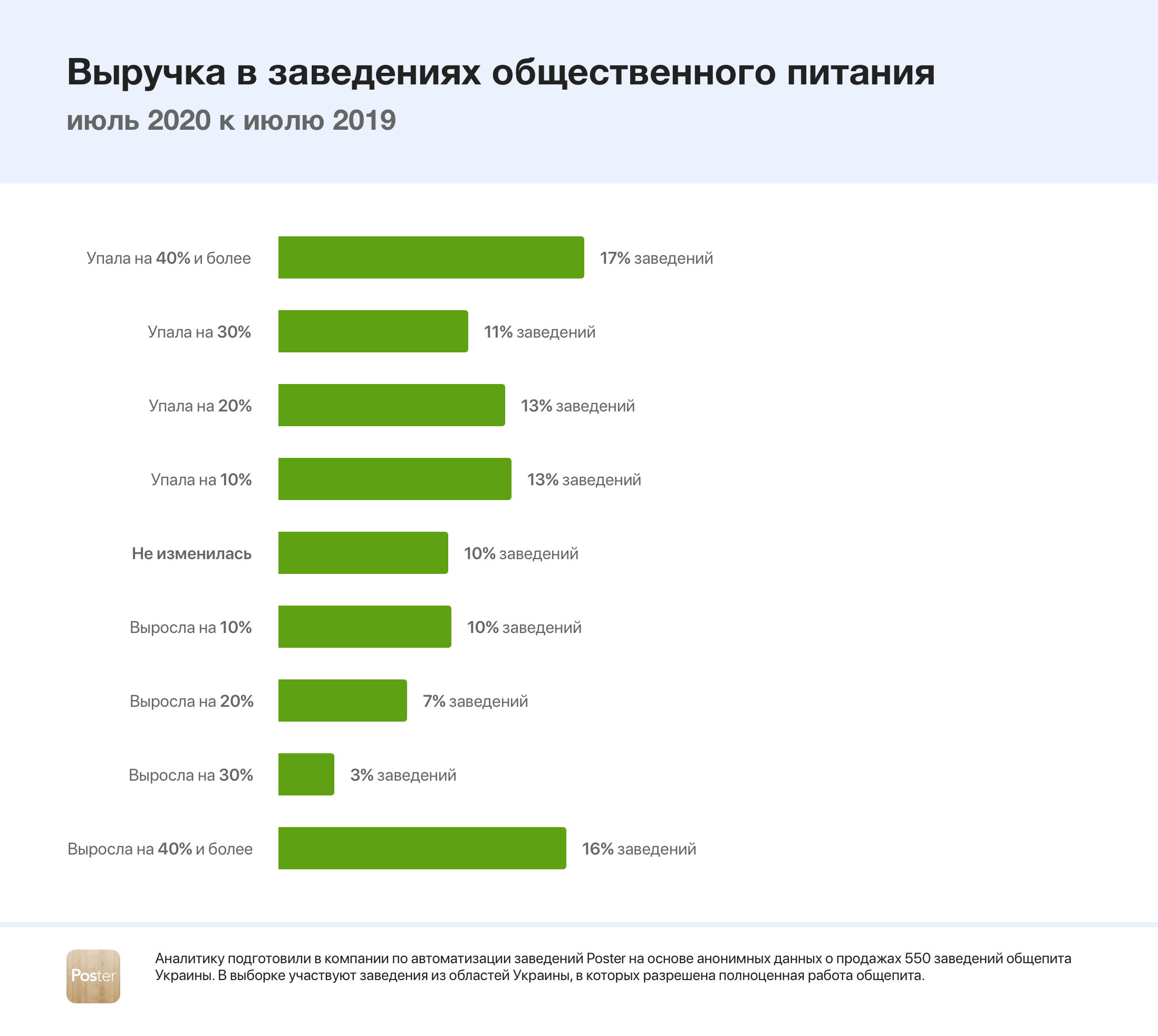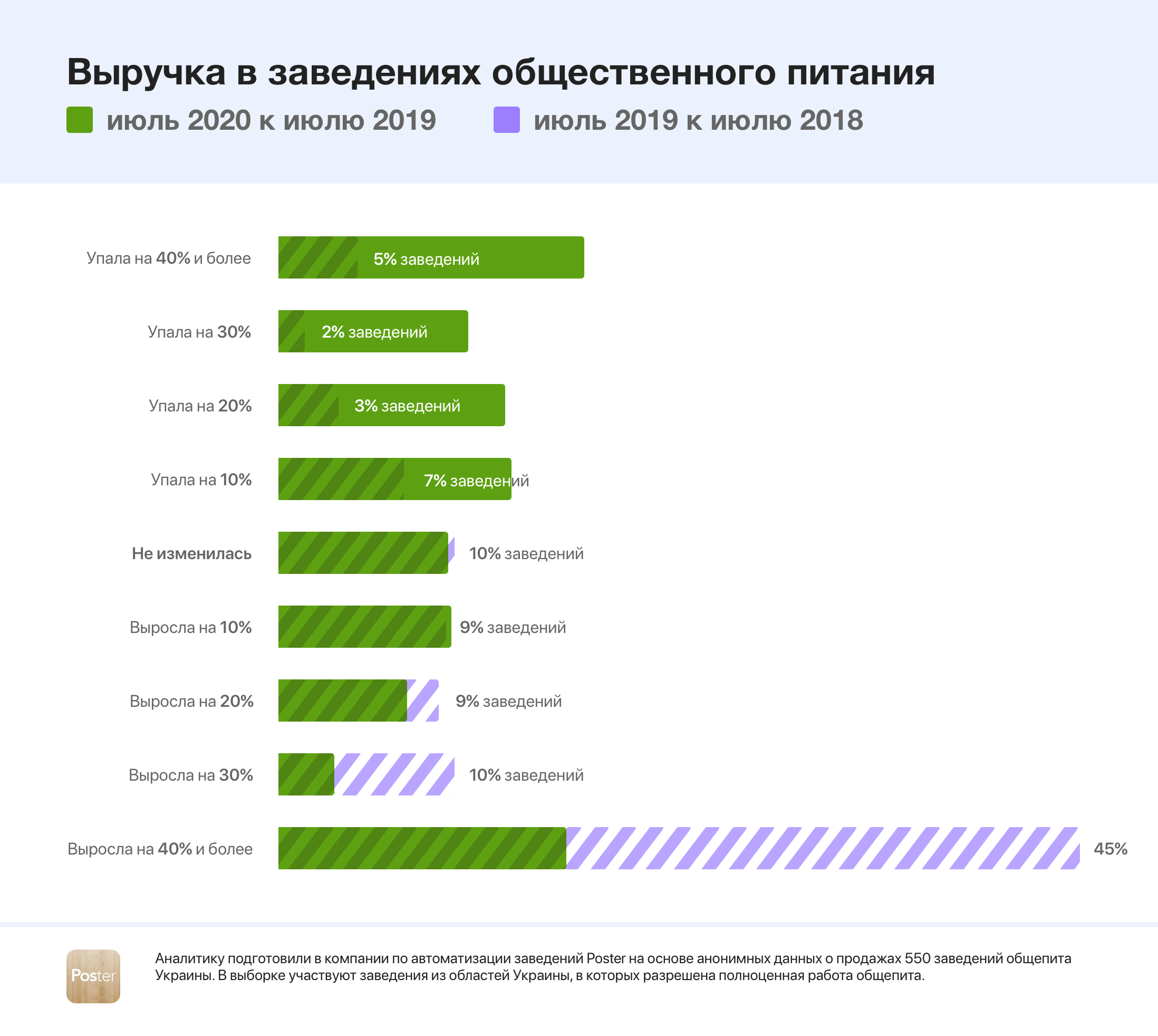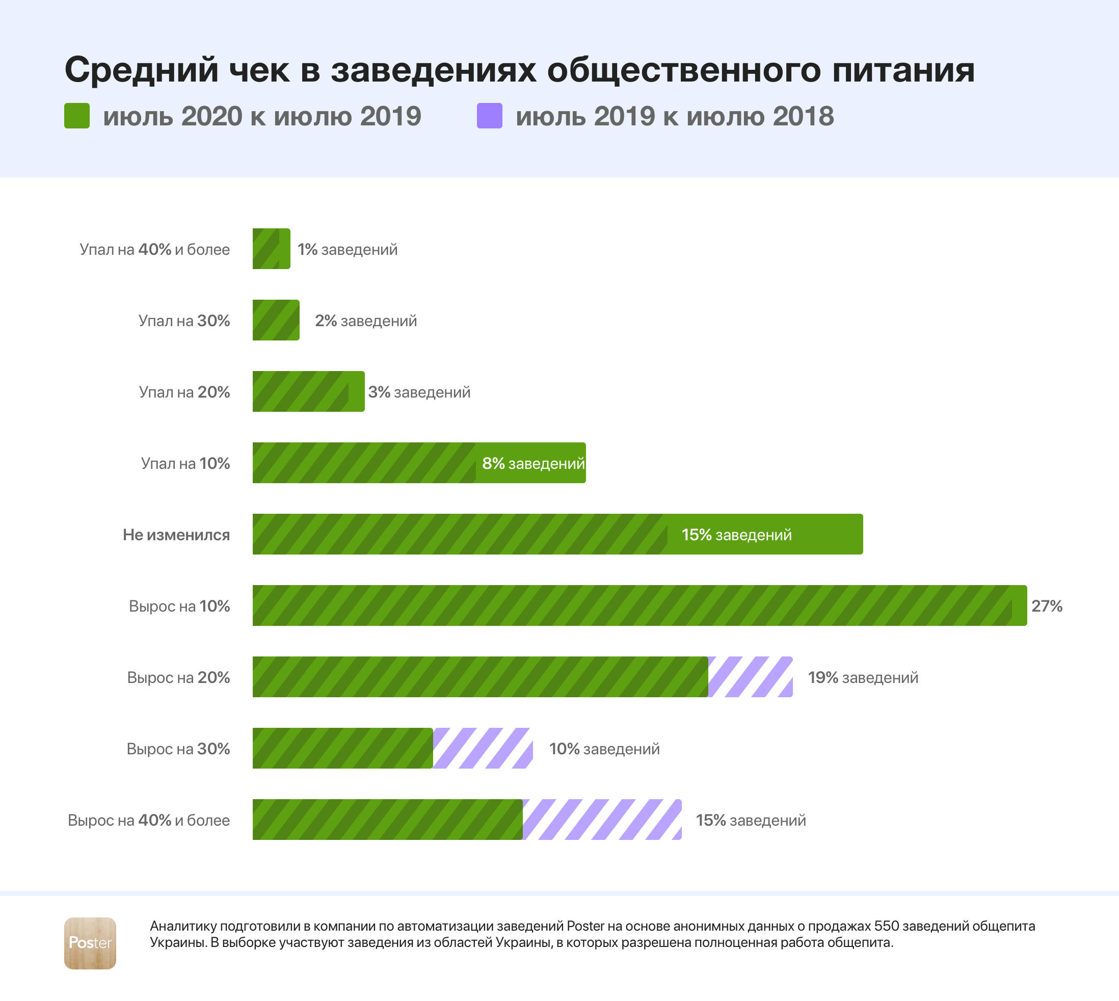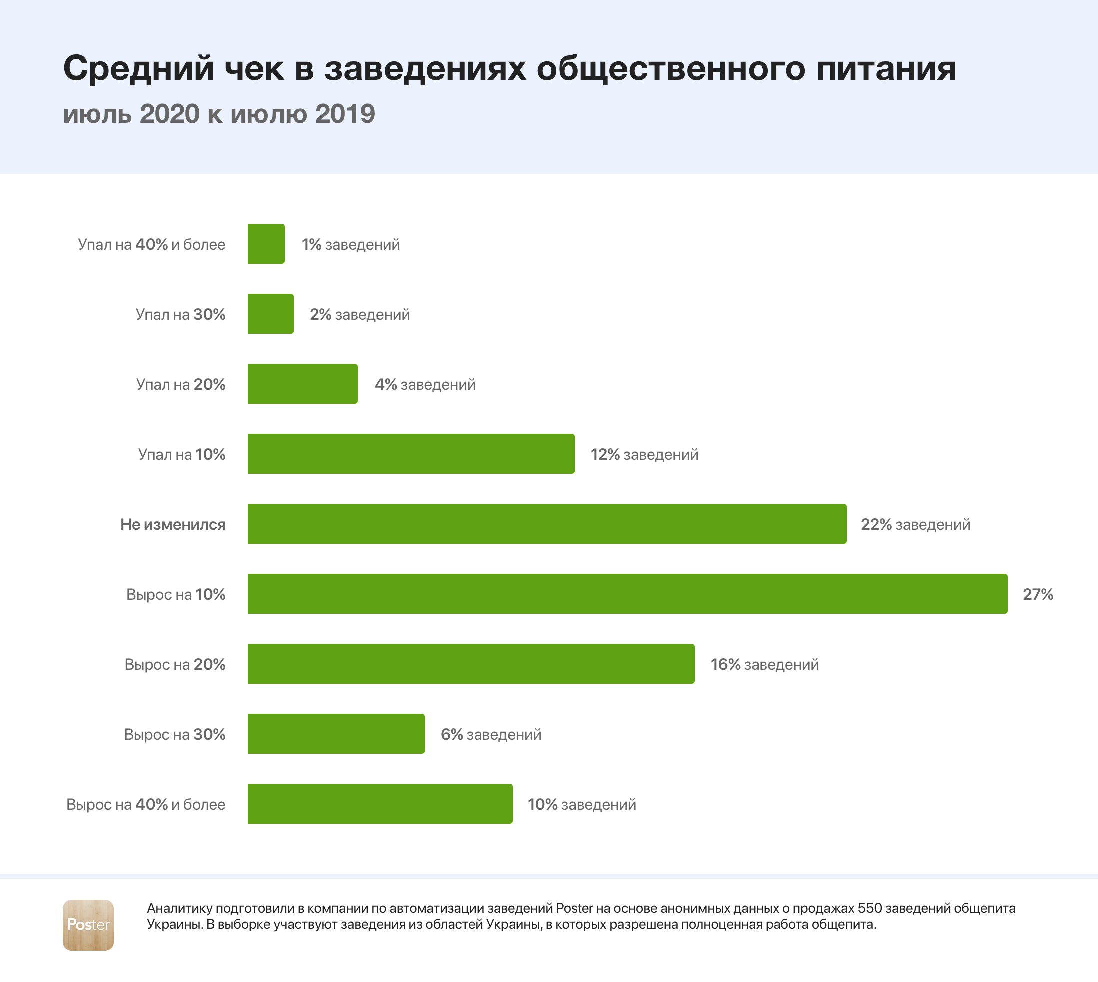 Об этом свидетельствует исследование компании по автоматизации кафе, ресторанов и магазинов Poster. В Poster проанализировали неперсонализированные операционные показатели около 550 заведений общепита — клиентов компании Poster — из областей Украины, в которых уже разрешена работа кафе и ресторанов в полноценном формате. Большинство респондентов — заведения демократичного и среднего ценовых сегментов. Сравниваемый период: с 29 июня по 5 июля 2020 года и с 1 по 7 июля 2019 года.