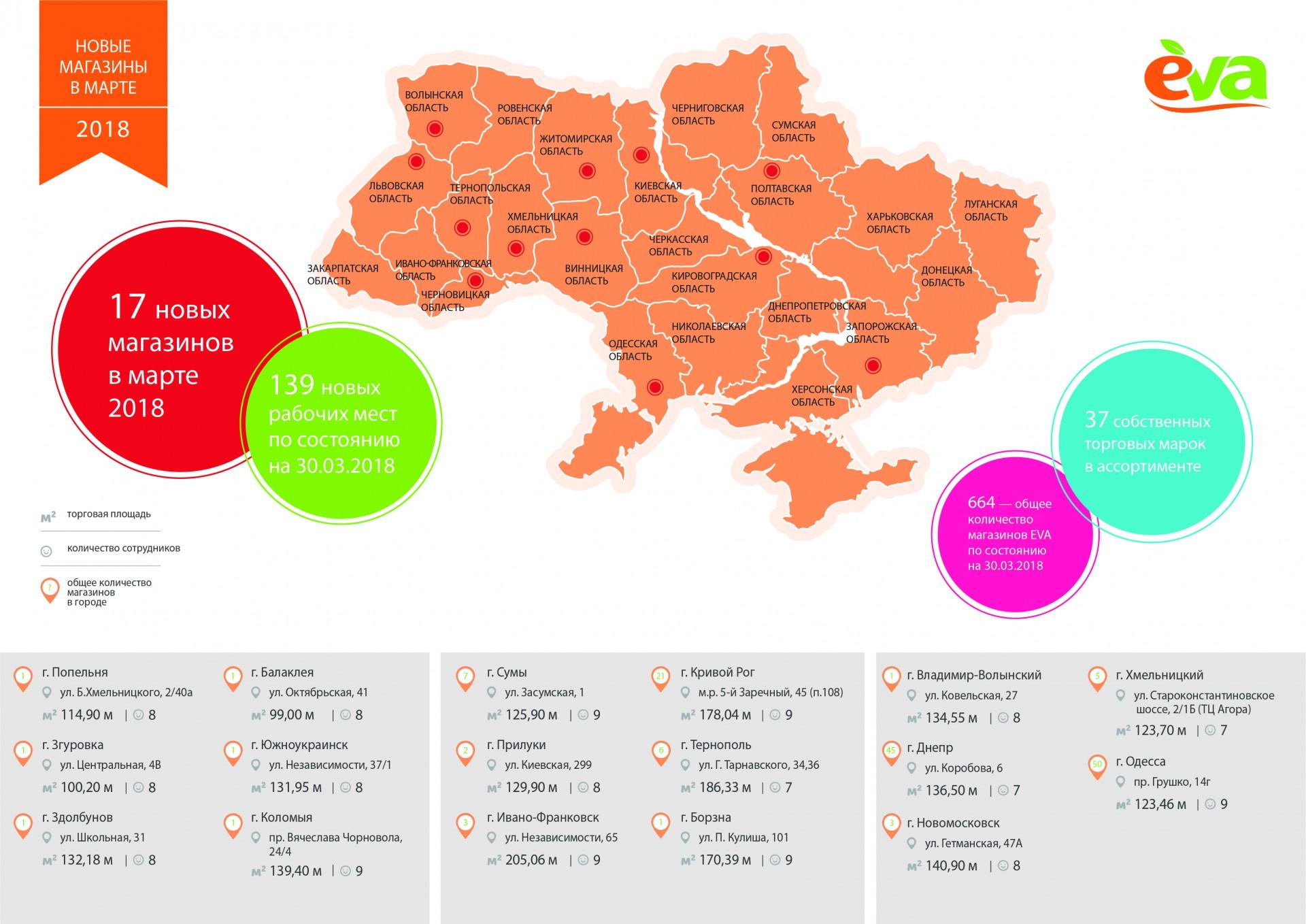 По итогам марта 2018 года сеть магазинов EVA увеличила свое присутствие на 17 магазинов. Об этом RAU сообщила пресс-служба сети. Общая площадь новых магазинов составила 2300 кв. м. Таким образом на данный момент сеть насчитывает 664 торговые точки.