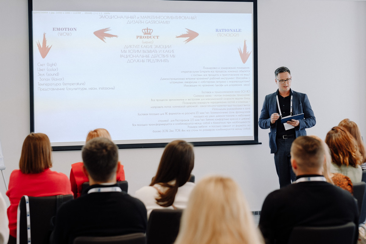 Архитектор GastroFamily Андрей Ефименко в своем выступлении раскрывал секреты эмоционального и маркетингоориентованного дизайна ресторанов Димы Борисова: как с помощью света, цвета, звука, запаха, температуры и представлений (скульптур, неона и инста-зон) достичь wow-эффекта в оформлении заведения.