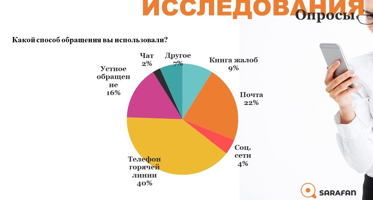 При этом лишь 9% использовали жалобную книгу. Почти половина опрошенных ответили, что использовали горячую линию, e-mail используют 22%, устно решить проблему на месте предпочитает 16%, а к соцсетям взывают 4% людей. При этом с 65% жаждущих справедливости клиентов просто не связались. Из тех, кто получил обратную связь, лишь немногим повезло достучаться до компании в течении часа, остальным ответили через несколько часов или на следующий день. А вопрос в соответствии с ожиданиями респондентов решается лишь в 25% случаев, у 22% частично и 53% вообще не решается.