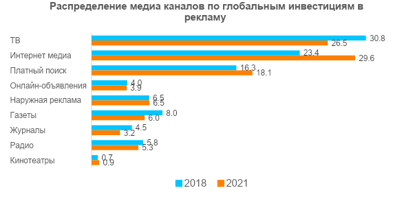 Печатные медиа продолжительное время теряют свою долю, читателей и рекламодателей из-за развития онлайн-платформ. Пик роста рекламы в печатных печатных медиа пришелся на 2007 год с отметкой $164 млрд, а в этом году составит всего лишь $70 млрд. Теперь и эфирное телевидение начинает падать, но не такими стремительными темпами, как печатные медиа. Zenith прогнозирует уменьшение инвестиций в рекламу на традиционном ТВ ежегодно с $184 млрд до 180 млрд в 2021 году.
