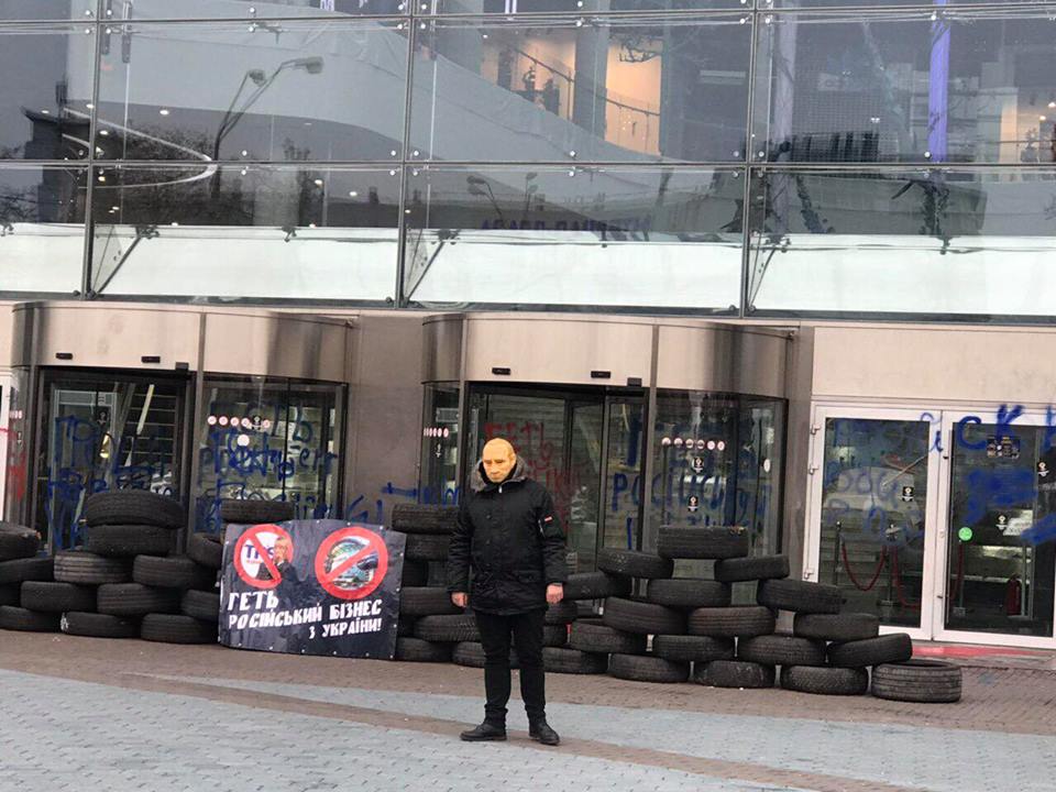 Столичный торговый центр Ocean Plaza не работает: представители националистических организаций принесли под стены ТРЦ шины и разрисовали их краской.