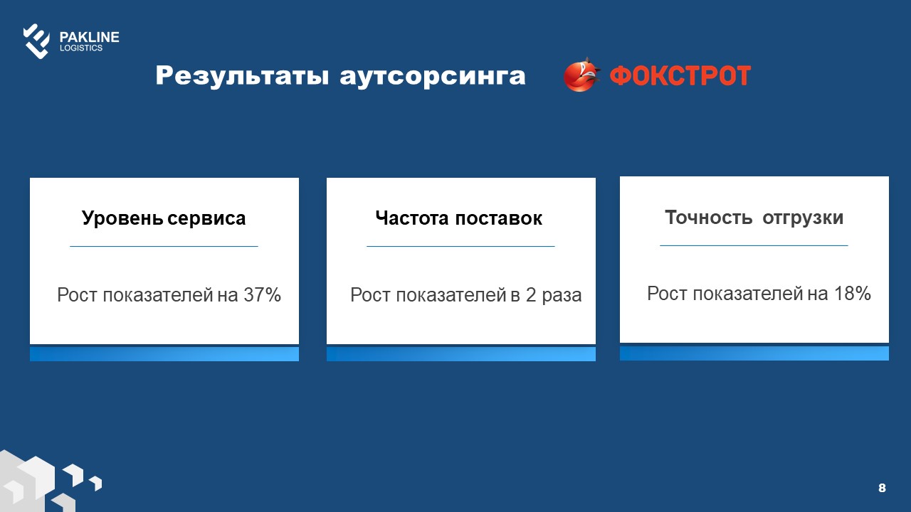 Самая крупная сеть по числу торговых точек по продаже электроники и бытовой техники Фокстрот воспользовалась аутсорсингом своей логистики. В 2018 году компания подписала договор об аутсорсинге. В результате через два года ритейлер смог нарастить уровень логистического сервиса (удовлетворения спроса запасами, своевременности получения товара магазином или конечным покупателем) на 37% и сейчас он составляет 99%.
