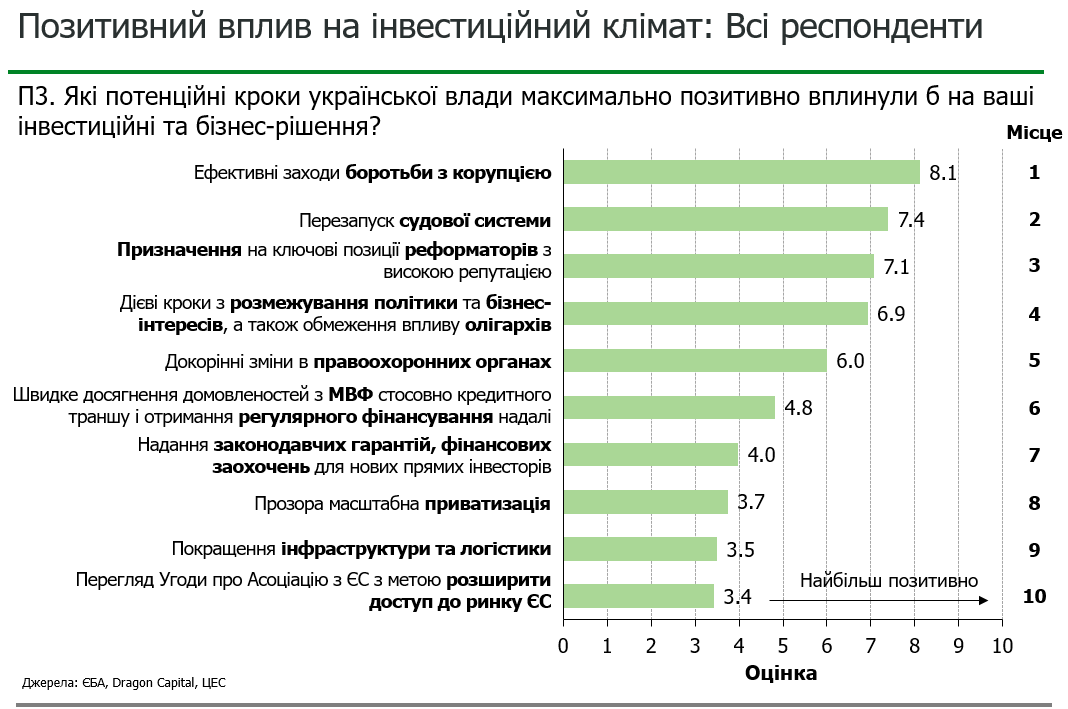 Эффективная борьба с коррупцией окажет самое благоприятное влияние на инвестиционный климат. Такое мнение разделяют и стратегические, и портфельные инвесторы. Другими важными факторами станут перезапуск судебной системы и назначение на ключевые позиции реформаторов с высокой репутацией.