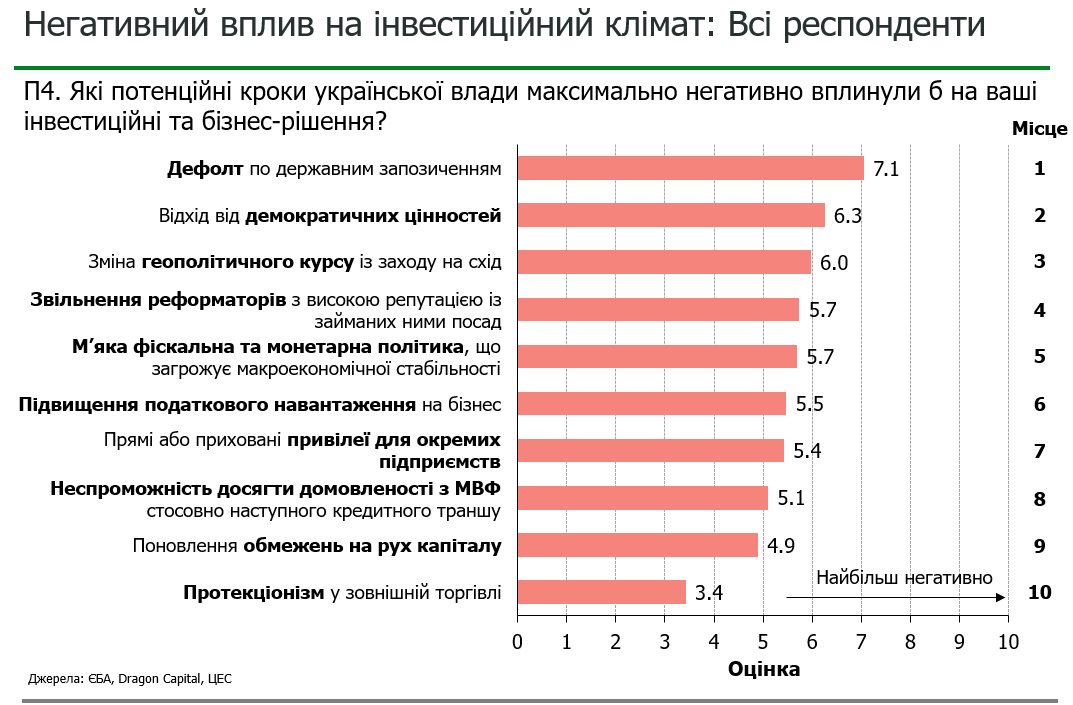 Дефолт по государственным заимствованиям был назван самой большой угрозой для инвестиционного климата. Вторую и третью позицию заняли отход от демократических ценностей и изменение геополитического курса. Стратегические инвесторы также видят угрозу в слишком мягкой бюджетной и монетарной политике, которая несет риски для макроэкономической стабильности. Портфельные инвесторы считают неспособность достичь договоренности с МВФ существенной угрозой дефолта.