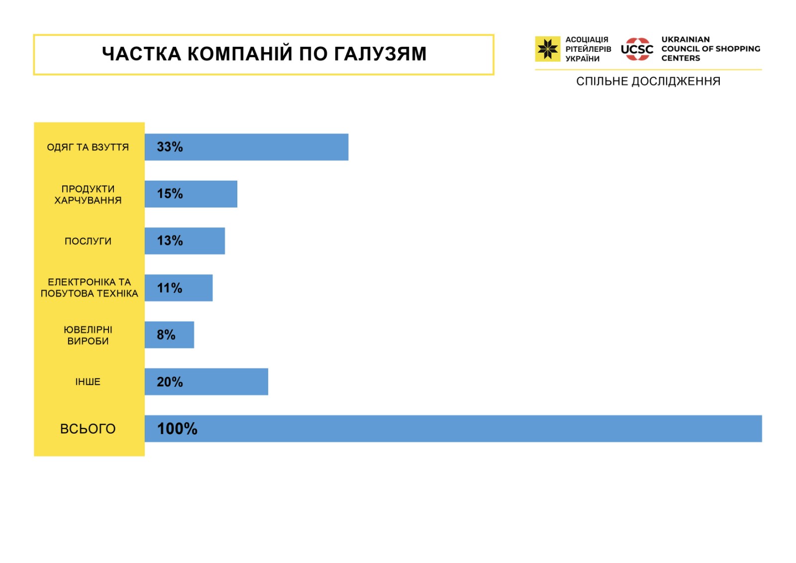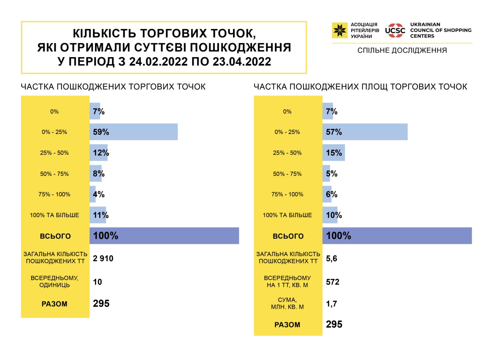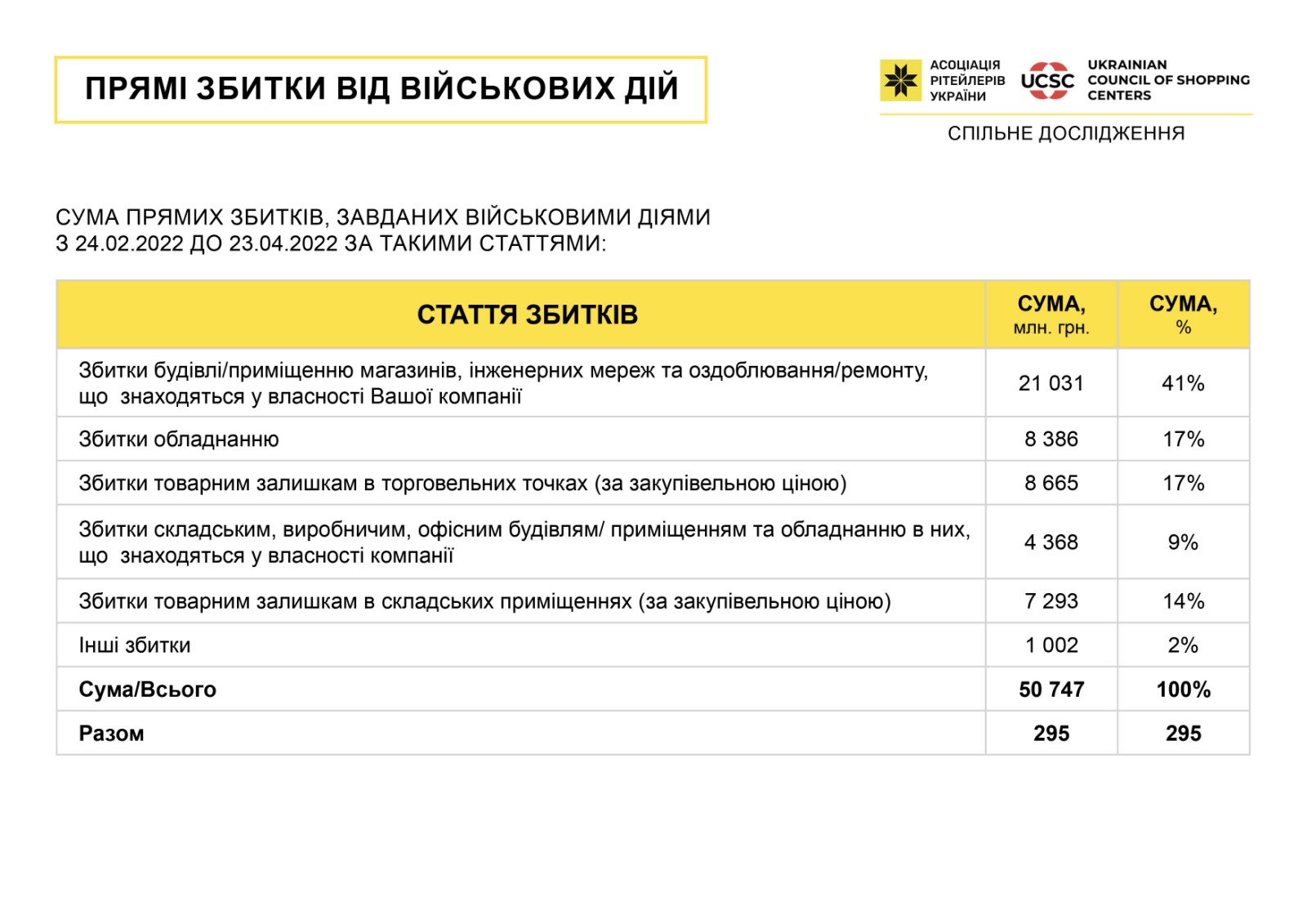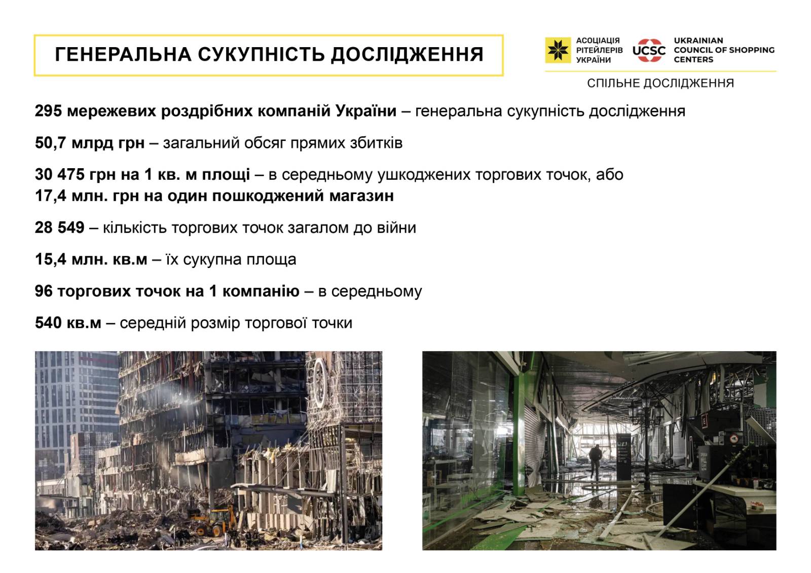 Генеральную совокупность исследования составили 295 ведущих розничных сетей Украины. Общий объем прямого убытка торговой сферы оценивается в 50,7 млрд грн. В среднем выходит по 30 475 грн на 1 кв. м площади поврежденных торговых точек или 17,4 млн грн на один поврежденный магазин.
