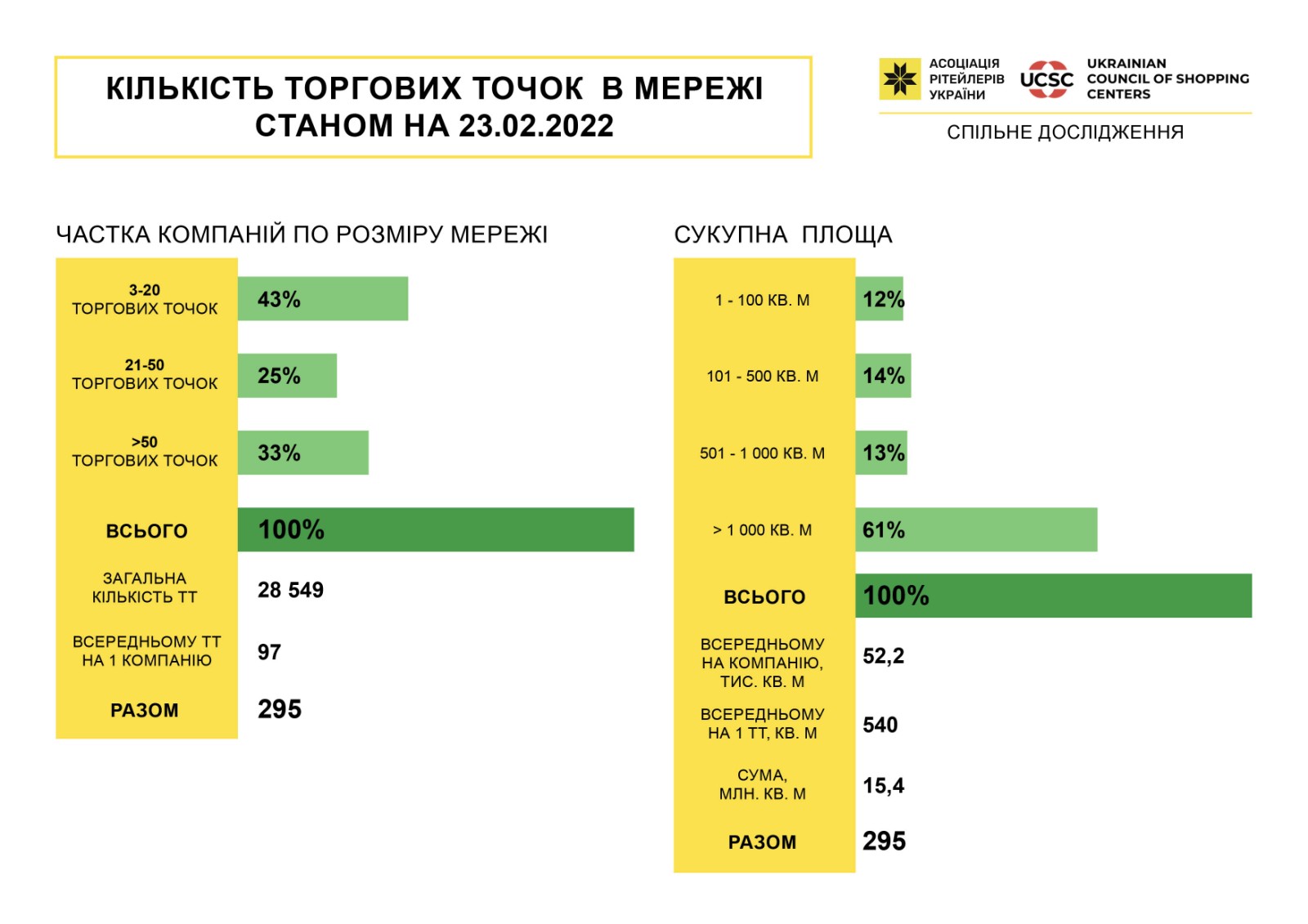 Данные компании представляют 28549 магазинов площадью 15,4 млн кв. м, работавших в Украине по состоянию на 24.02.2022 года. То есть в среднем 96 торговых точек на одну компанию, а средний размер торговой точки – 540 кв. м.