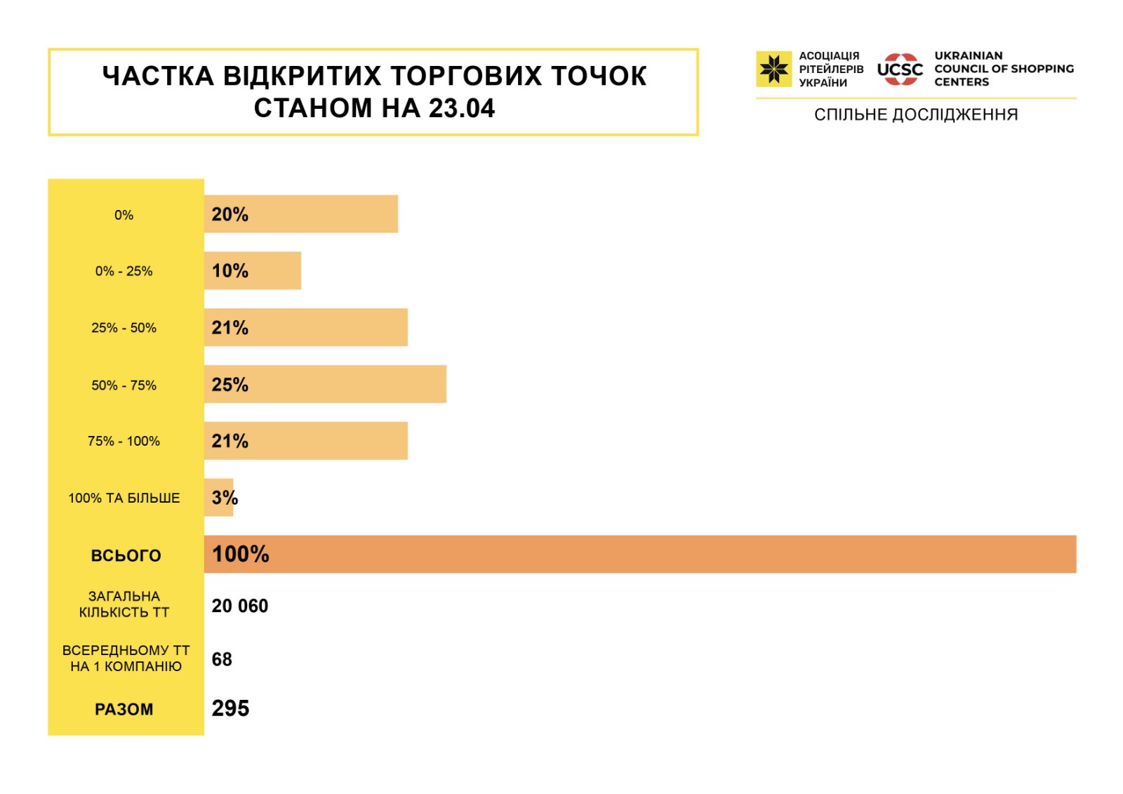 Через два месяца после начала боевых действий продолжали работать 20 060 магазинов общей площадью 11,4 млн кв. м. То есть только 70% от довоенного количества точек (28549) и 74% от объема довоенной площади (15,4 млн кв. м). В среднем у каждой компании было открыто 68 торговых точек. Пятая часть сетей была закрыта вообще, у 10% компаний работали не более четверти магазинов, а у 21% сетей – не более половины. Только 3% ритейлеров имели возможность не только работать по полной, но и открывать новые торговые точки.