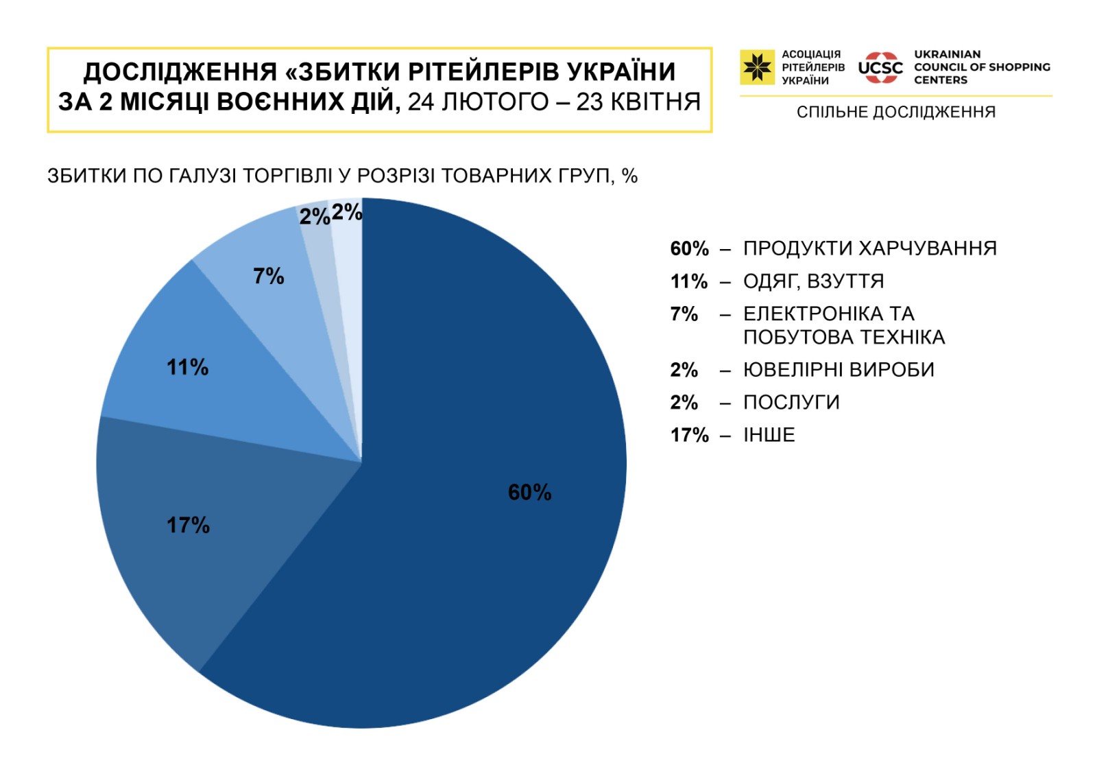 В разрезе товарных групп больше всего пострадали продовольственные сети, во многом из-за широкой представленности на рынке и большого среднего размера торговой точки. FMCG-операторы оценивают свои общие потери в 30,249 млрд грн (60% потерь), из которых большинство касается поврежденных собственных помещений магазинов.