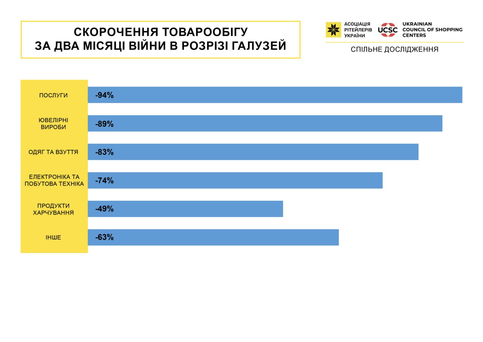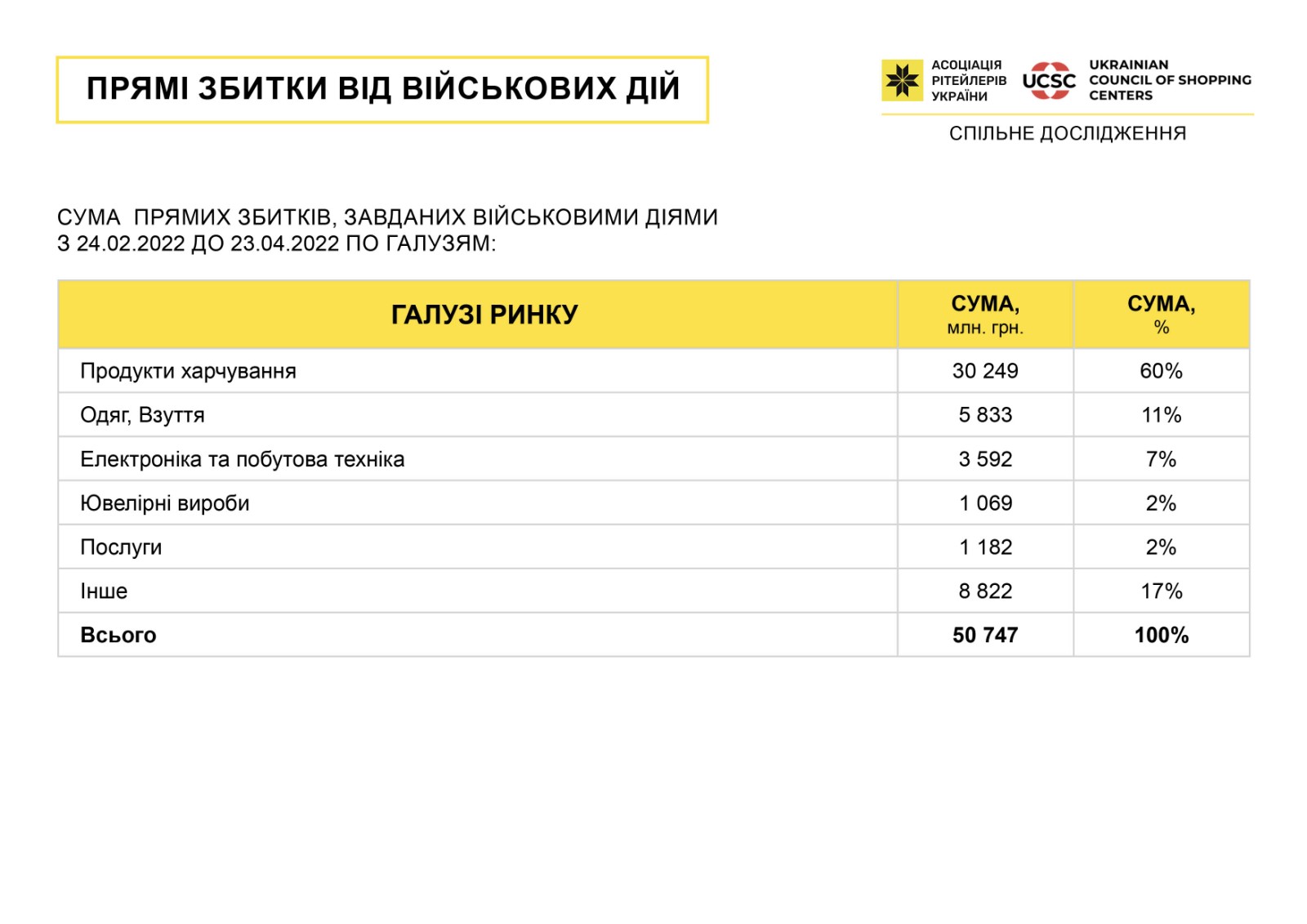 В мае Ассоциация ритейлеров Украины и Украинский совет торговых центров (УСТЦ) провели исследование, охватившее 295 торговых компаний – крупных сетей и малых предпринимателей. Общая цифра потерь по этим сетевым ритейлерам составляет 50,7 млрд грн.