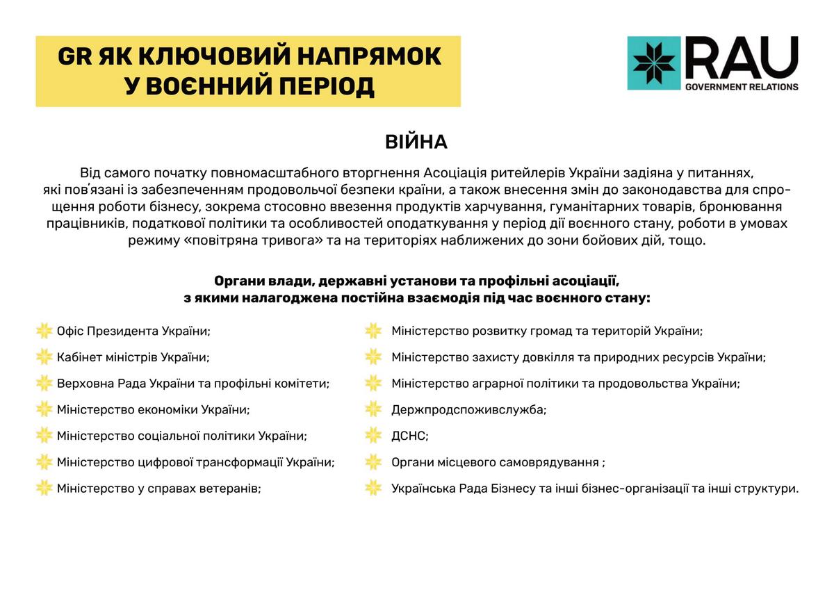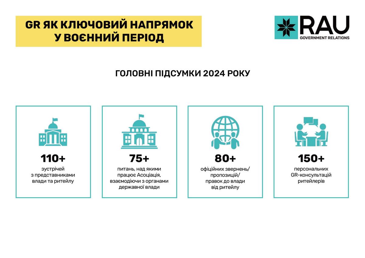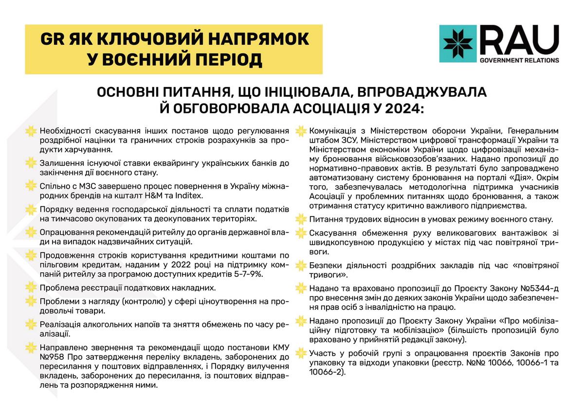 Ассоциация продемонстрировала системный подход во взаимодействии с органами государственной власти, направленный на защиту интересов отрасли. Деятельность была сосредоточена на вопросах упрощения регуляторных процедур, введении е-бронирования для защиты критически важных работников, поддержке национальных программ, совершенствовании законодательного поля и поддержке инициатив, направленных на обеспечение продовольственной безопасности страны, развитие инфраструктуры и благоприятных условий для развития ритейла.