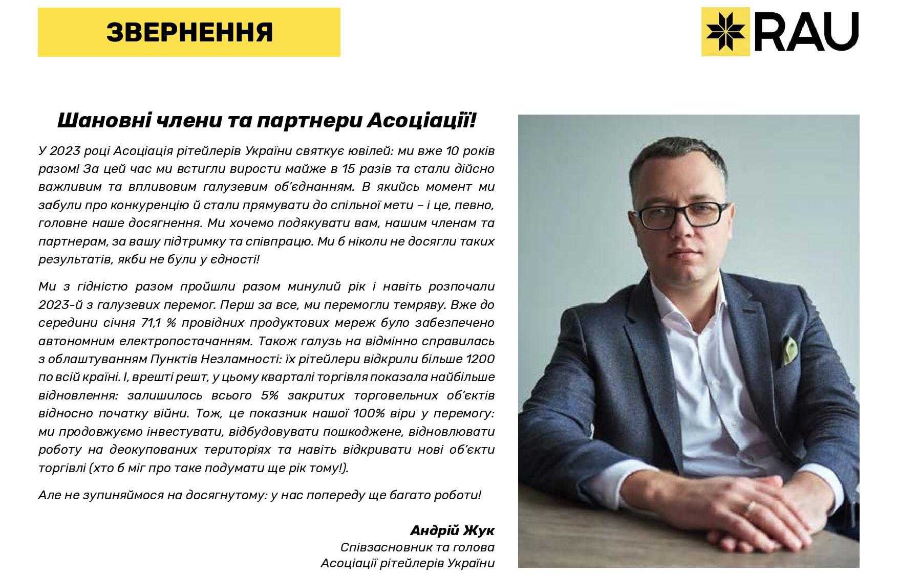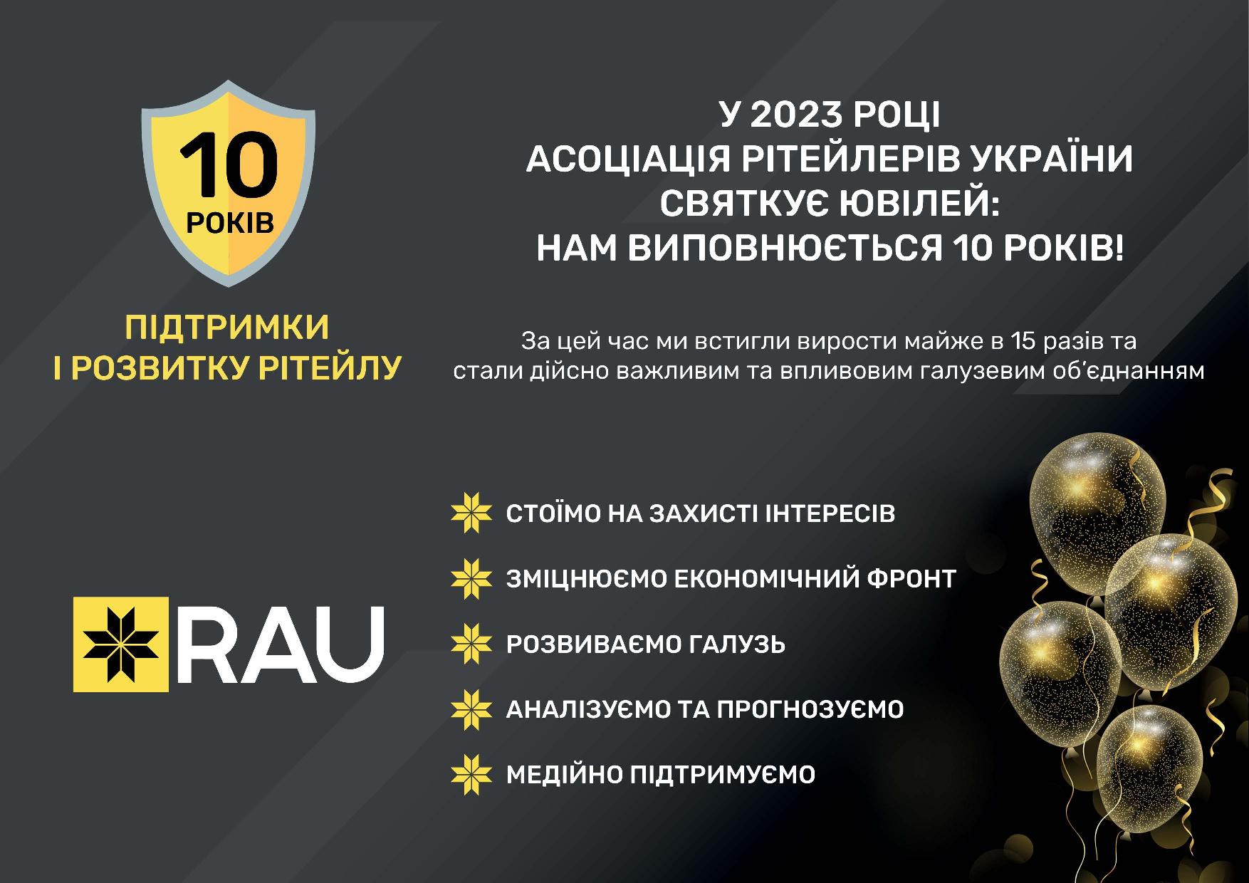 В 2023 году Ассоциация ритейлеров Украины празднует юбилей: мы уже 10 лет вместе! За это время мы успели вырасти почти в 15 раз и стали действительно важным и влиятельным отраслевым объединением. В какой-то момент мы забыли о конкуренции и стали направляться к общей цели – и это, наверное, главное наше достижение. Мы хотим поблагодарить вас, наших членов и партнеров, за вашу поддержку и сотрудничество. Мы бы никогда не добились таких результатов, если бы не были в единстве.