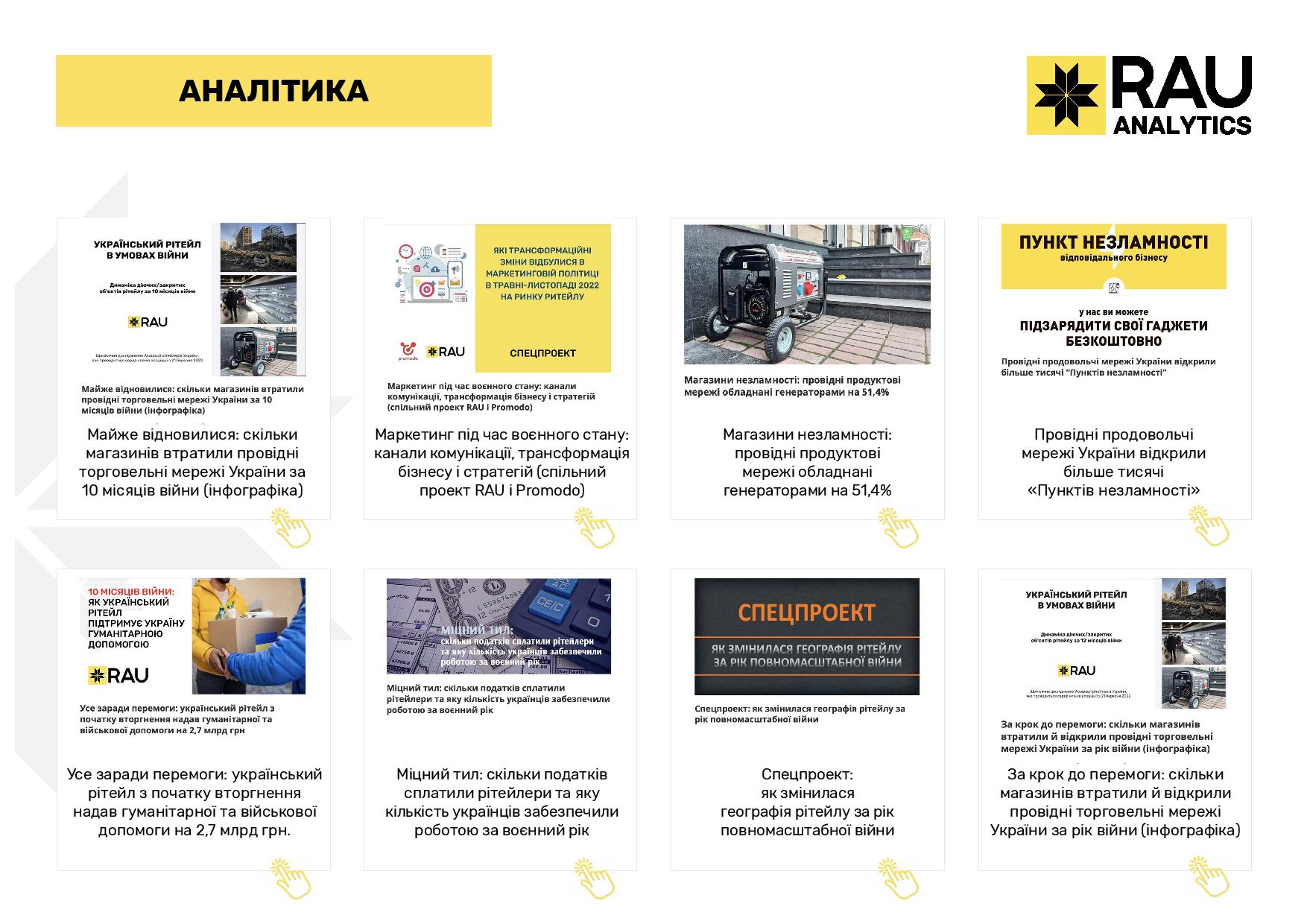 Мы с достоинством вместе прошли прошлый год и даже начали 2023-й с отраслевых побед. Прежде всего, мы победили тьму. Уже к середине января 71,1% ведущих продуктовых сетей было обеспечено автономным электроснабжением. Также отрасль отлично справилась с обустройством Пунктов Несокрушимости: их ритейлеры открыли более 1200 по всей стране. И, наконец, в этом квартале торговля показала наибольшее восстановление: осталось всего 5% закрытых торговых объектов относительно начала войны. Это показатель нашей 100% веры в победу: мы продолжаем инвестировать, восстанавливать поврежденное, возобновлять работу на деоккупированных территориях и даже открывать новые объекты торговли (кто бы мог такое подумать еще год назад). Но не останавливаемся на достигнутом: у нас впереди еще много работы.