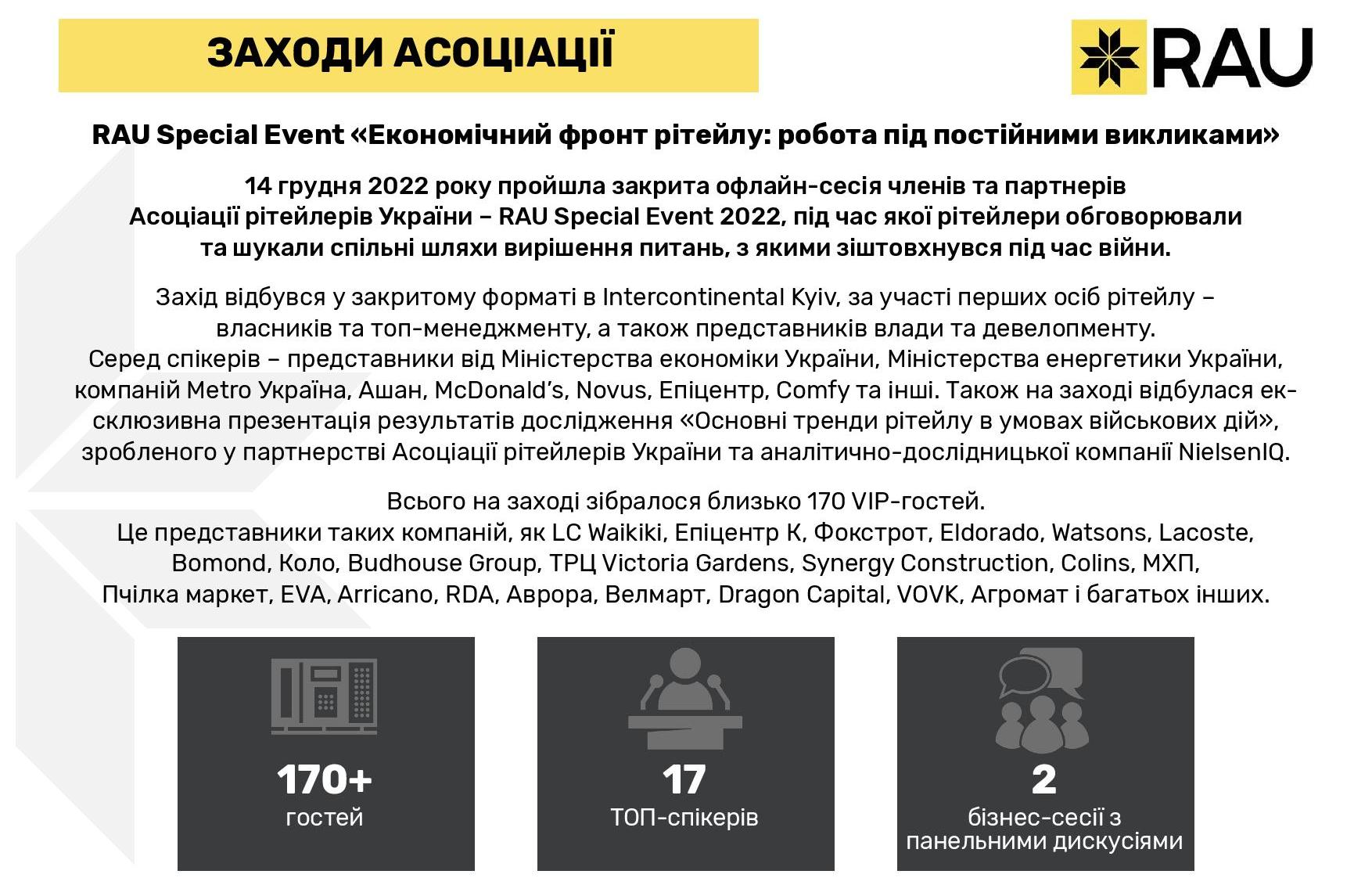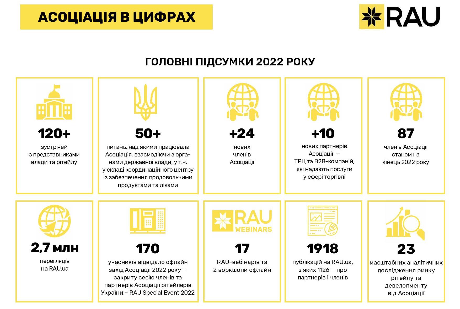 Итоги работы Ассоциации ритейлеров Украины в 2022 году в цифрах и графиках: какие члены и партнеры присоединились к RAU, что было сделано и какие результаты получены.